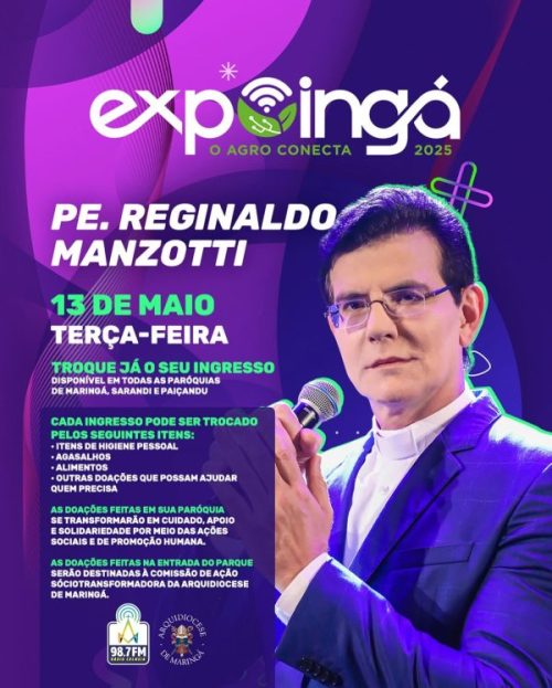 No dia 13 de maio, terça-feira, a Expoingá abrirá suas portas gratuitamente para um evento que une fé, música e solidariedade. A Arena de Shows será palco de um grande encontro religioso, com a Santa Missa presidida pelo Padre Reginaldo Manzotti e, logo após, show de evangelização.