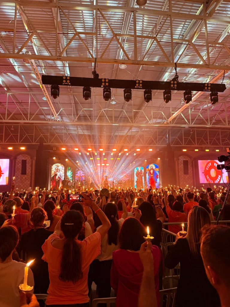 Em um gesto simbólico e profundamente significativo, milhares de fiéis acenderam suas velas, iluminando o espaço e representando a chama do Espírito Santo acesa em cada coração. A imagem das luzes espalhadas pelo local traduziu o tema do encontro e tornou visível o compromisso de manter viva a fé, mesmo diante das tempestades da vida.