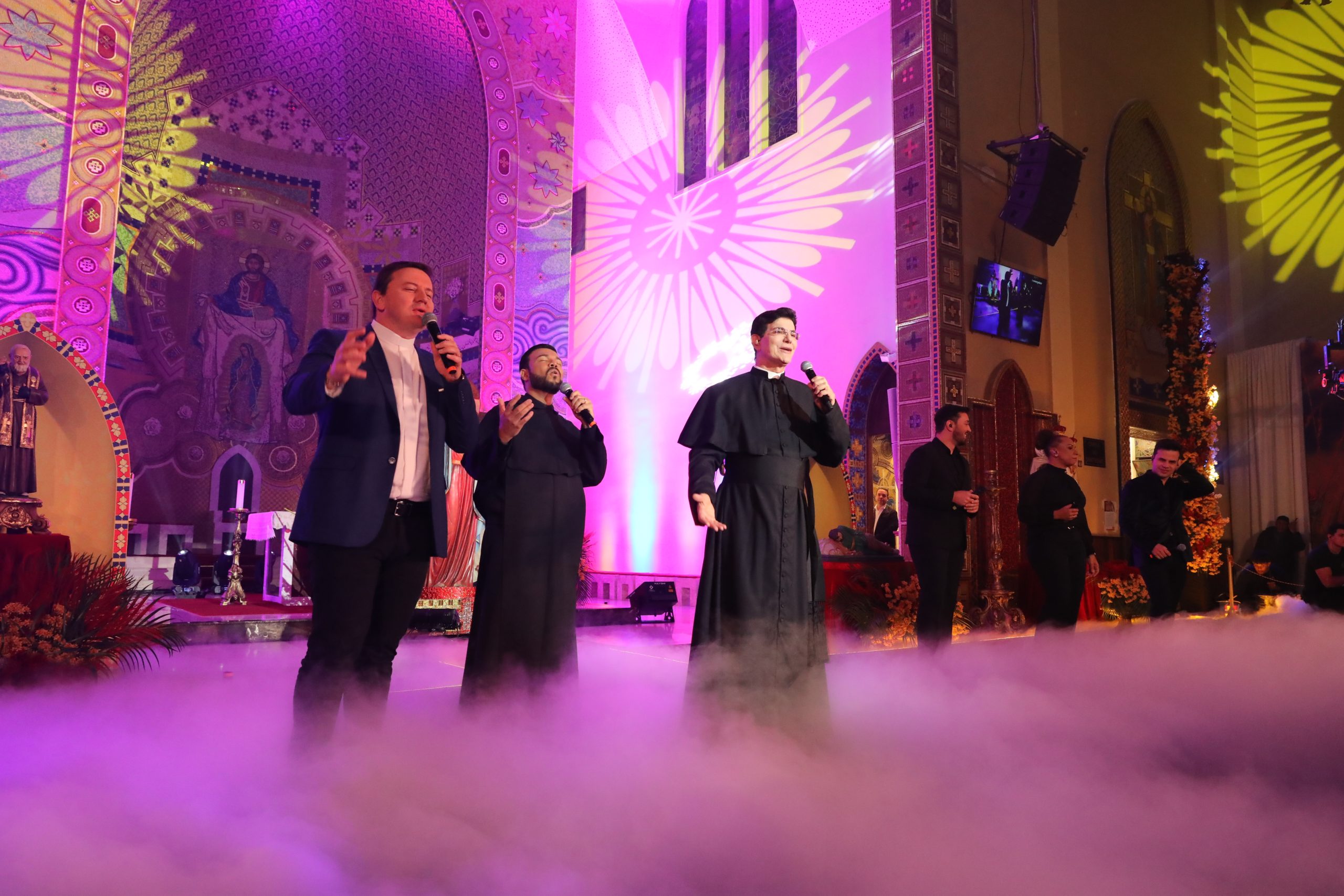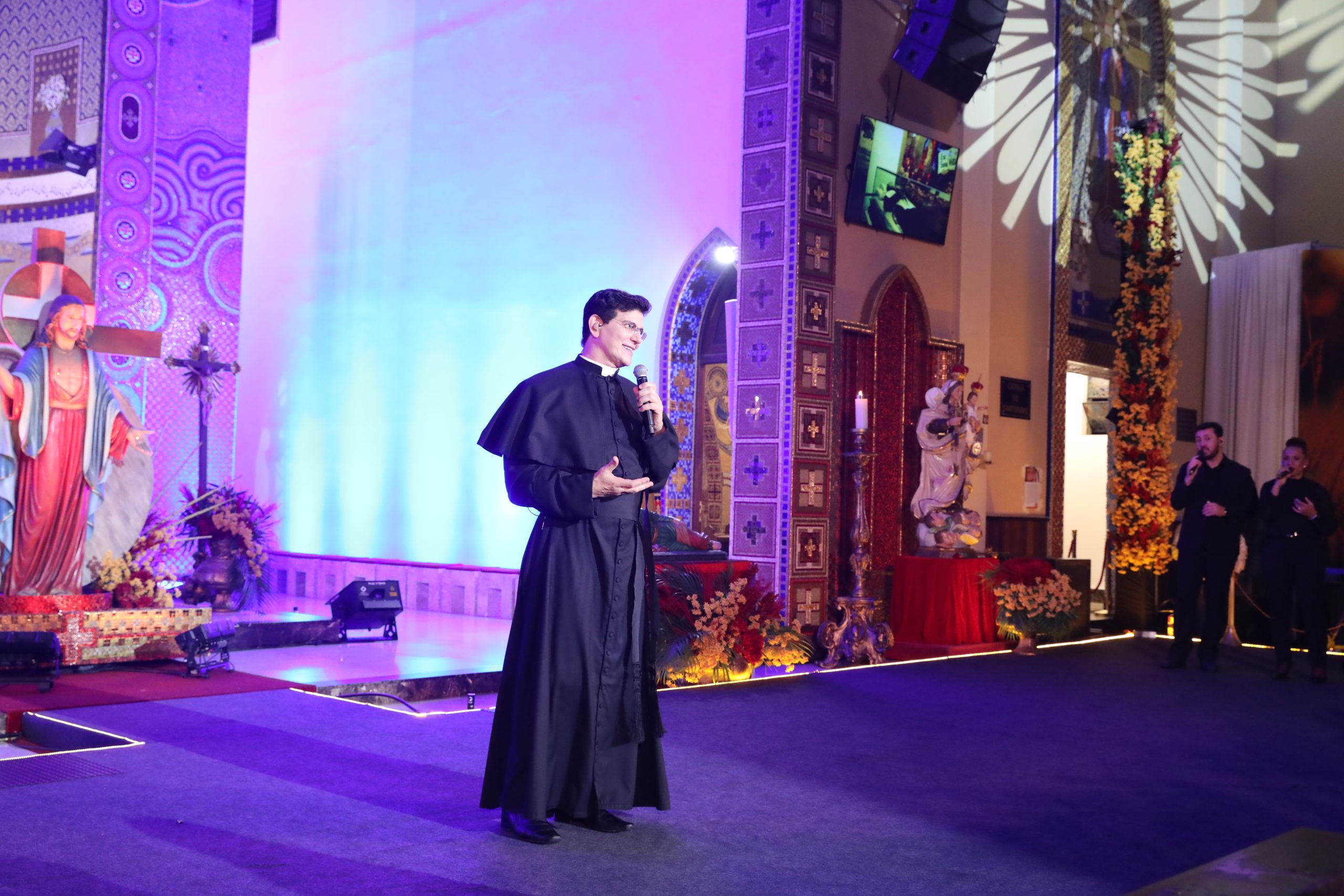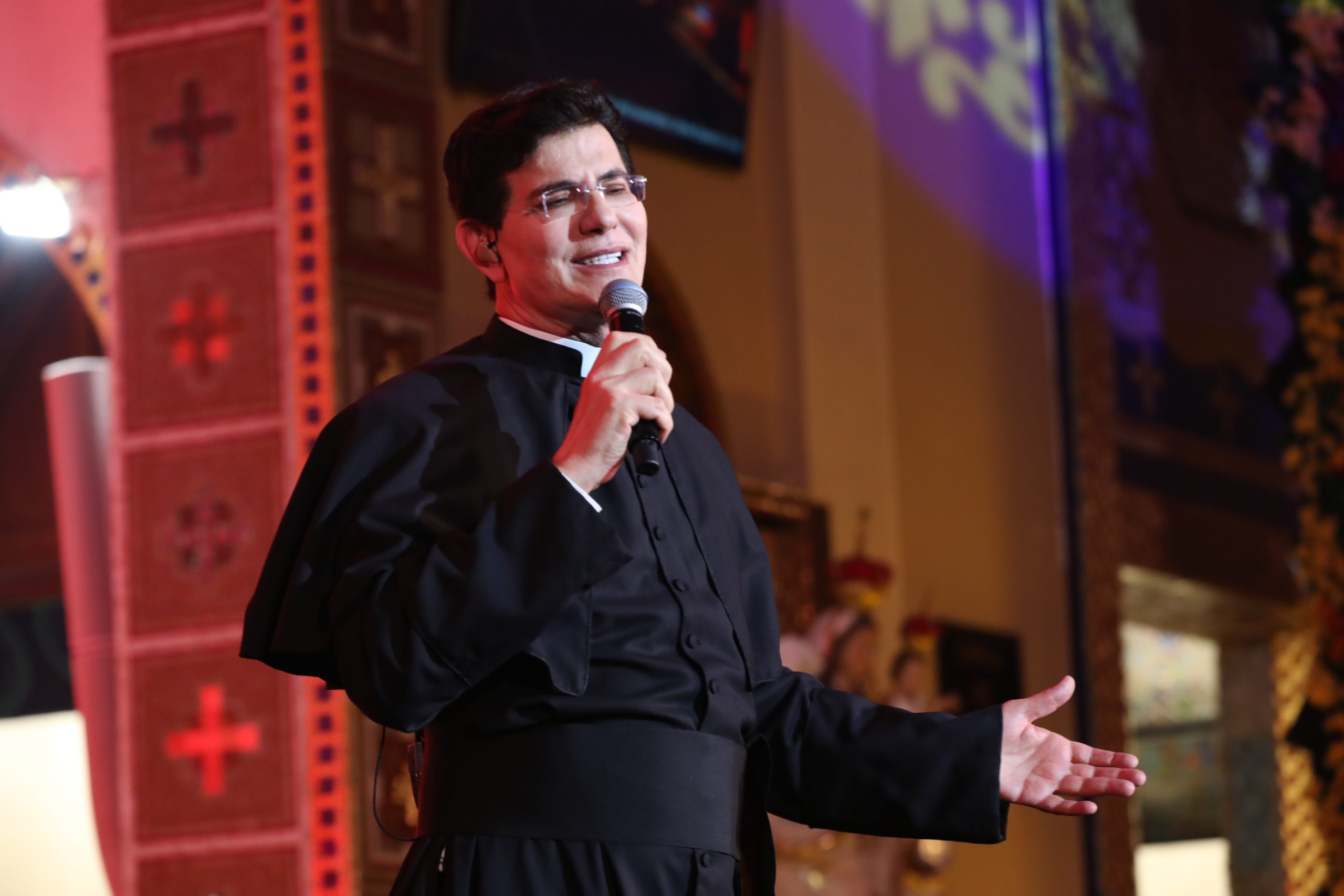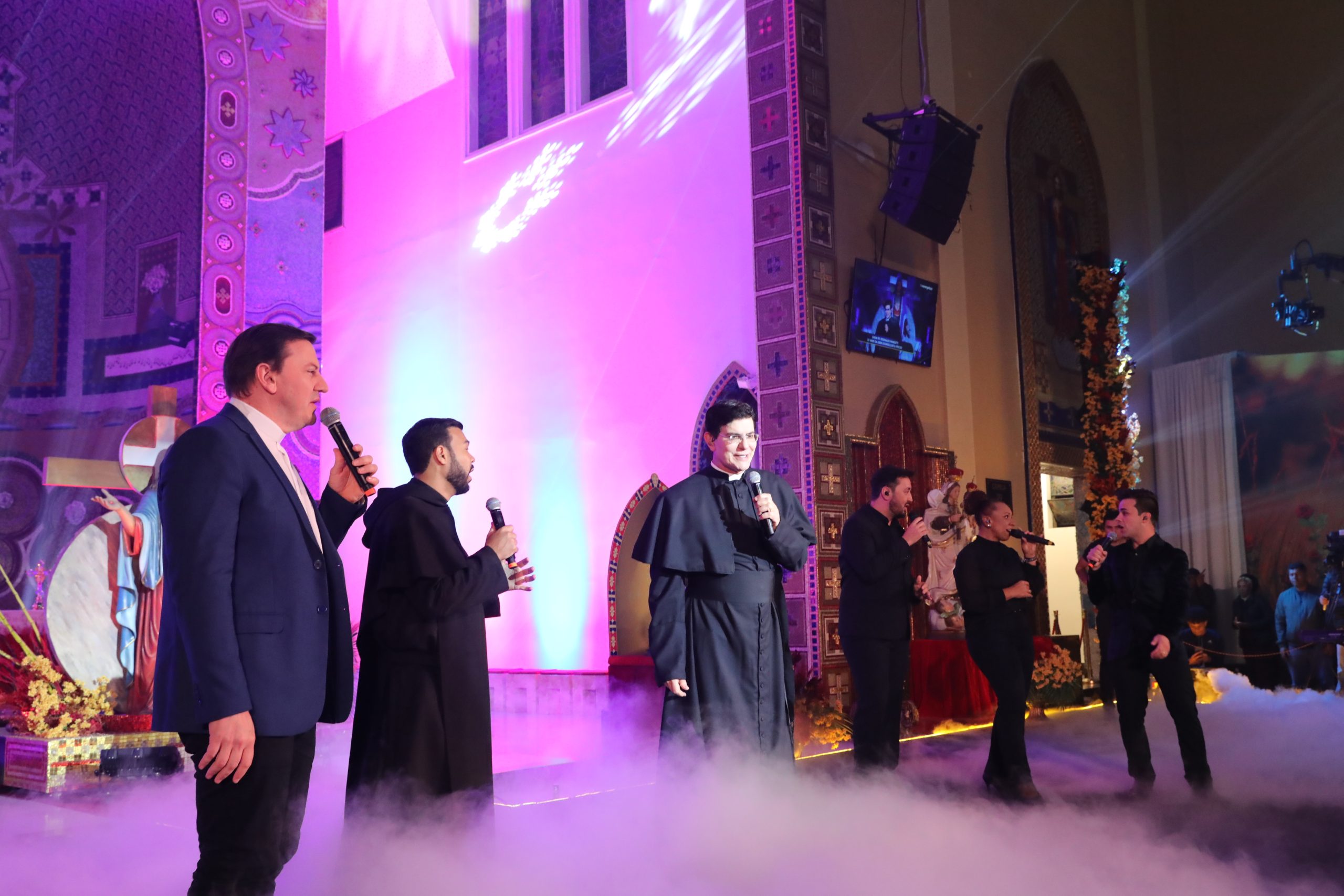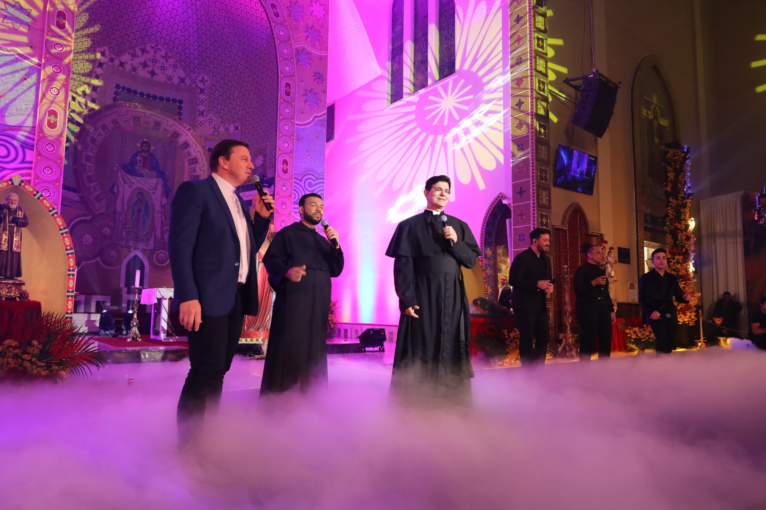 Padre Reginaldo Manzotti recebeu Frei Renan, Padre Ezequiel Dal Pozzo e Joelma Datovo no seu show desta sexta-feira na X Festa das Santas Chagas. O show marcou o início do Jubileu de 20 anos da Associação Evangelizar É Preciso.