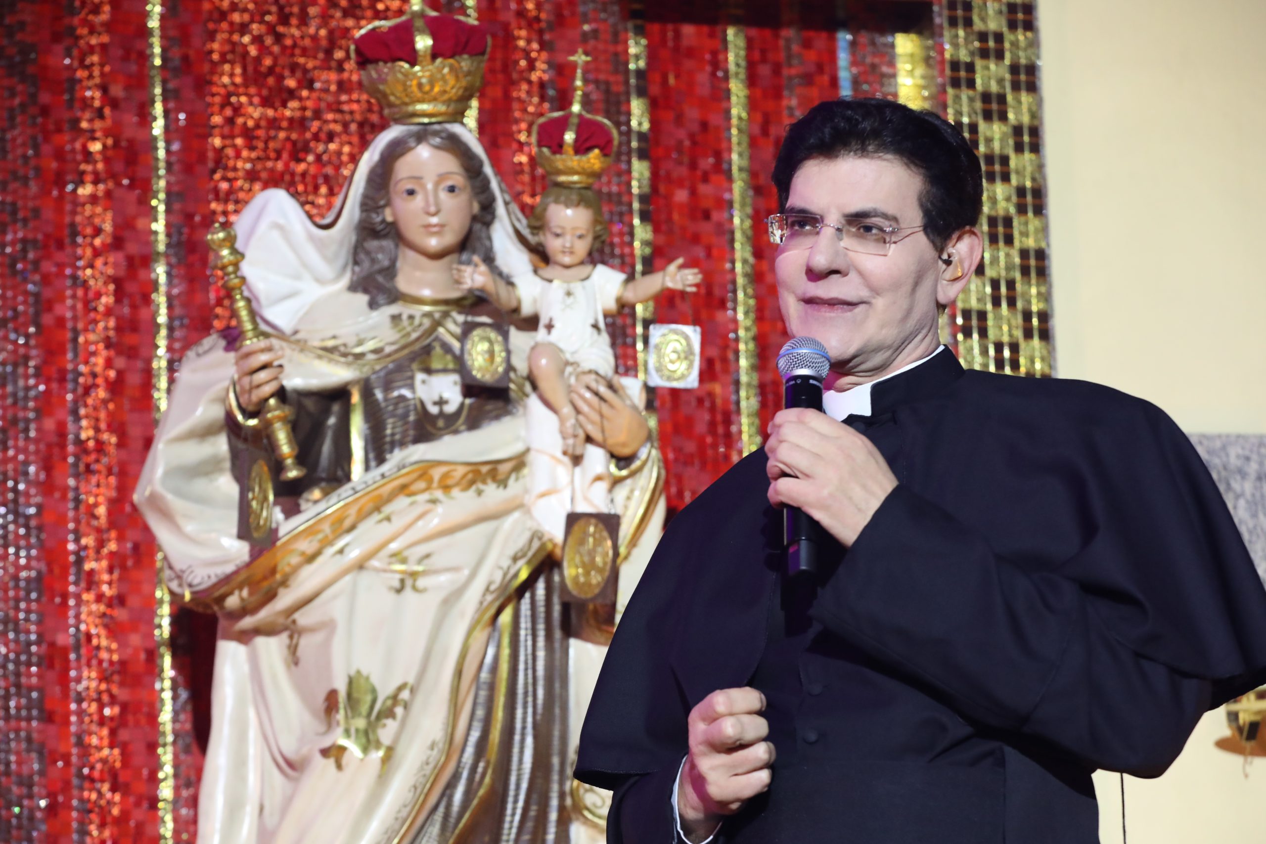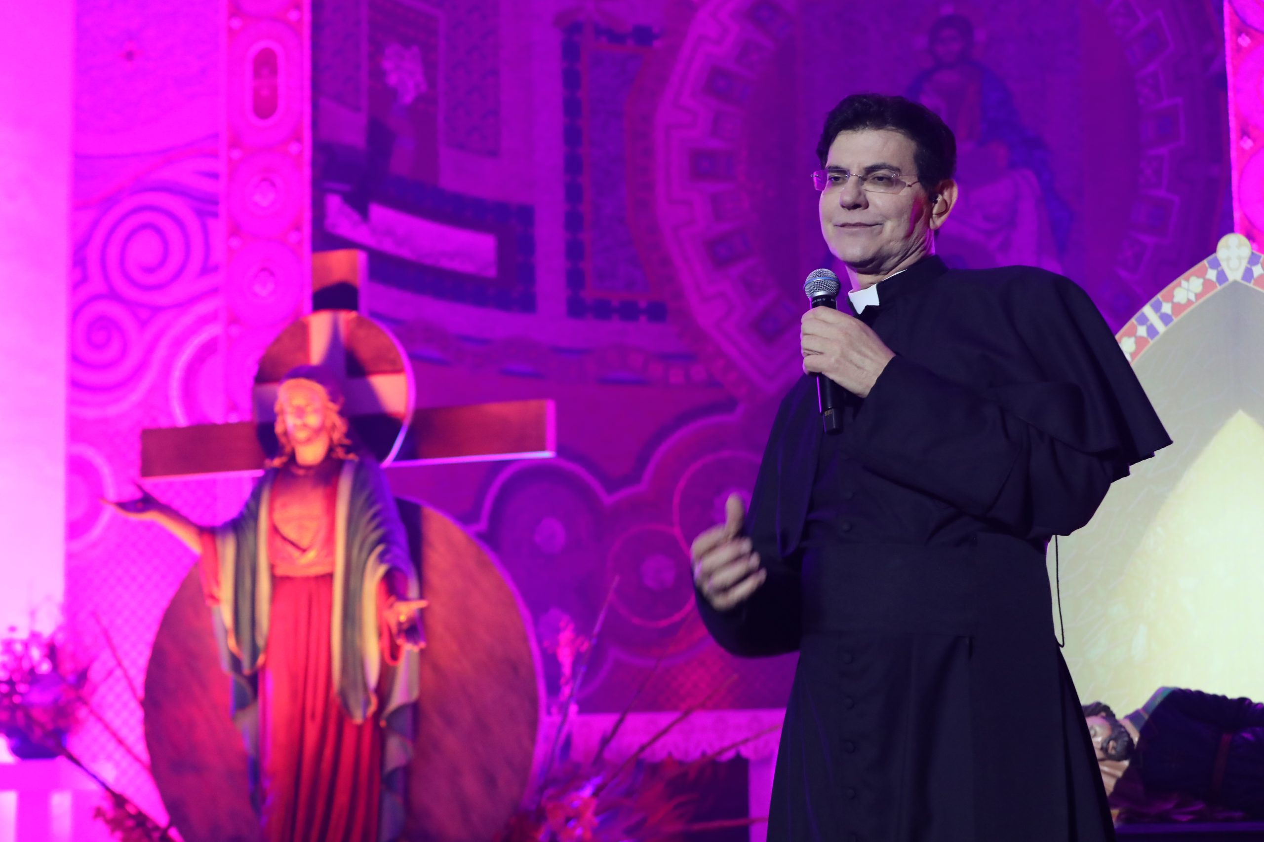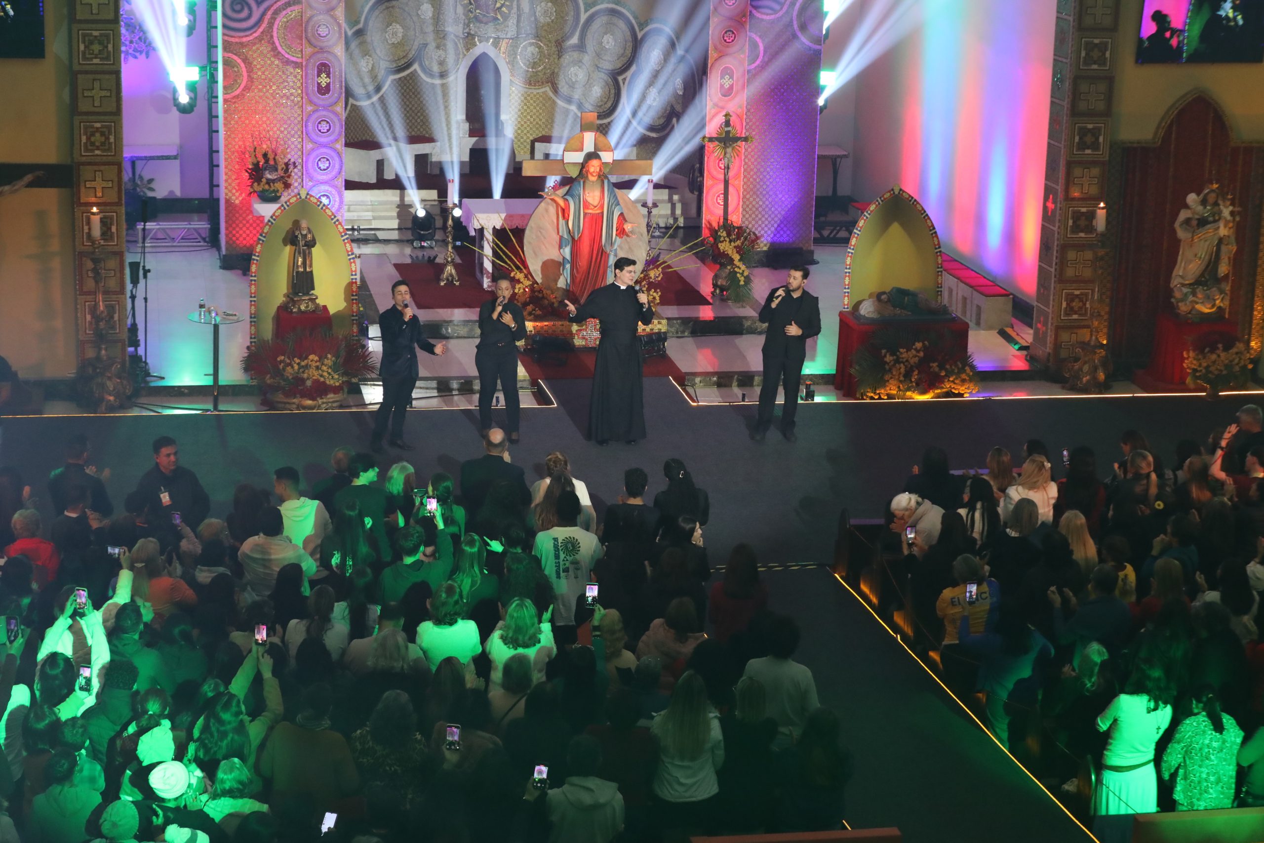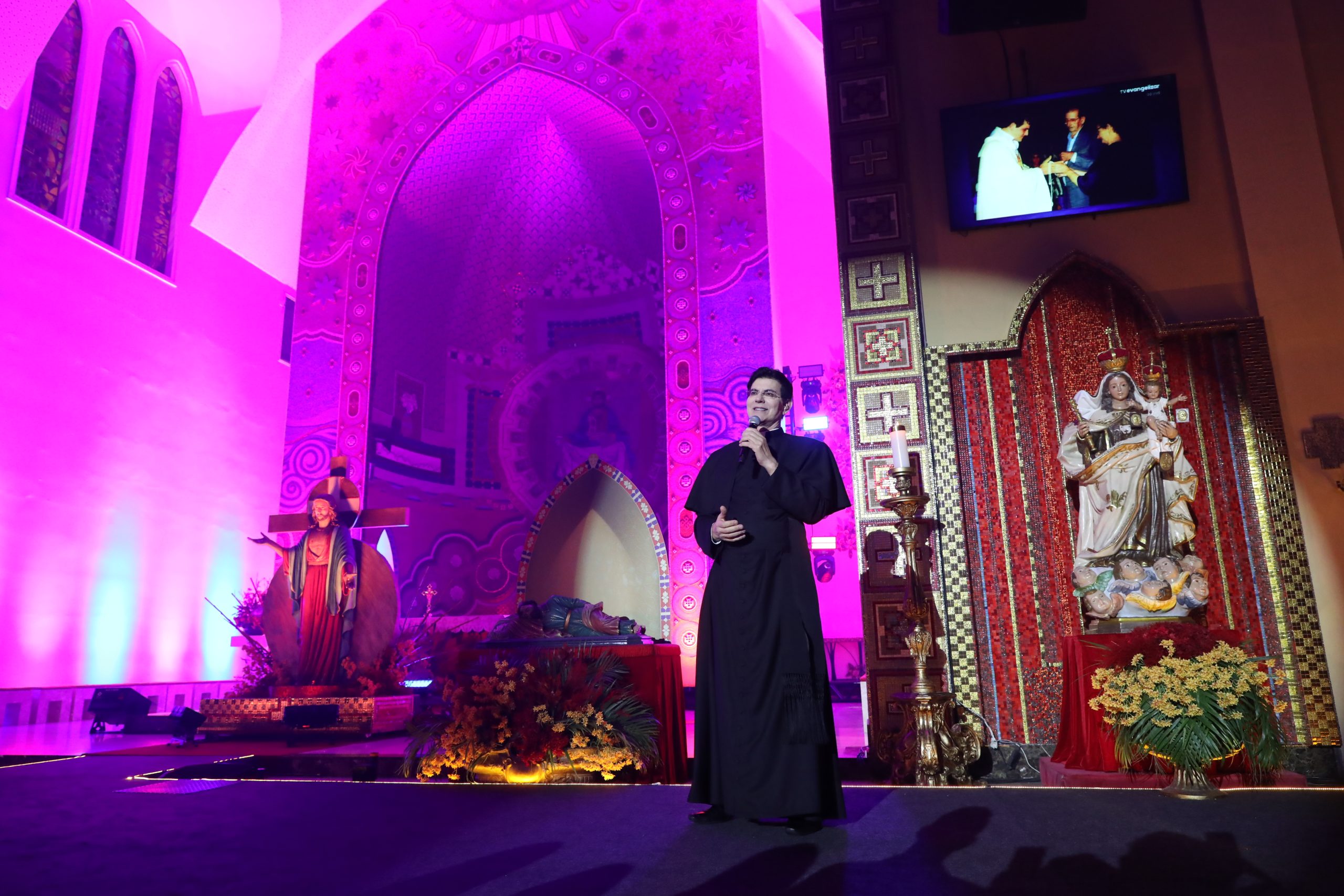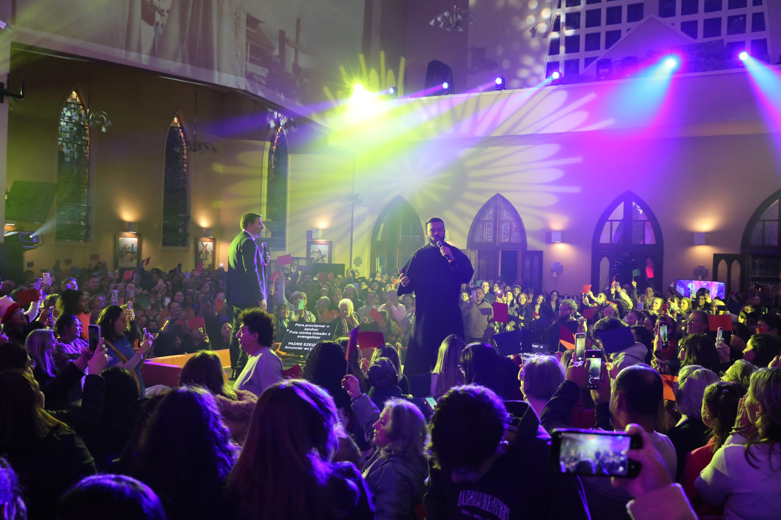 Padre Reginaldo Manzotti recebeu Frei Renan, Padre Ezequiel Dal Pozzo e Joelma Datovo no seu show desta sexta-feira na X Festa das Santas Chagas. O show marcou o início do Jubileu de 20 anos da Associação Evangelizar É Preciso.