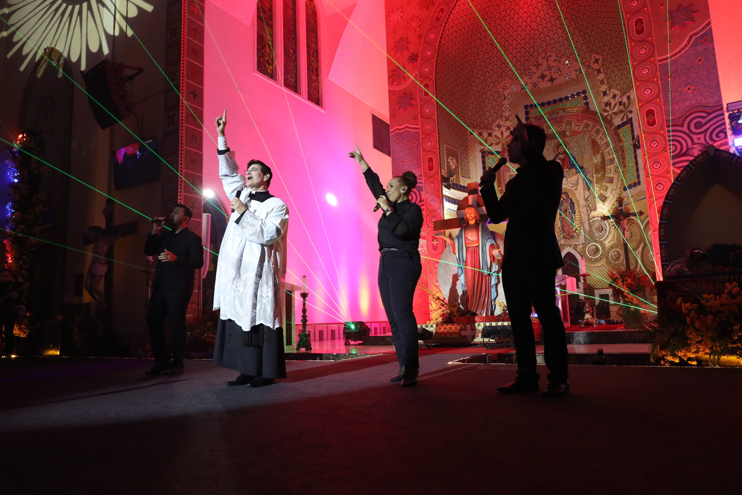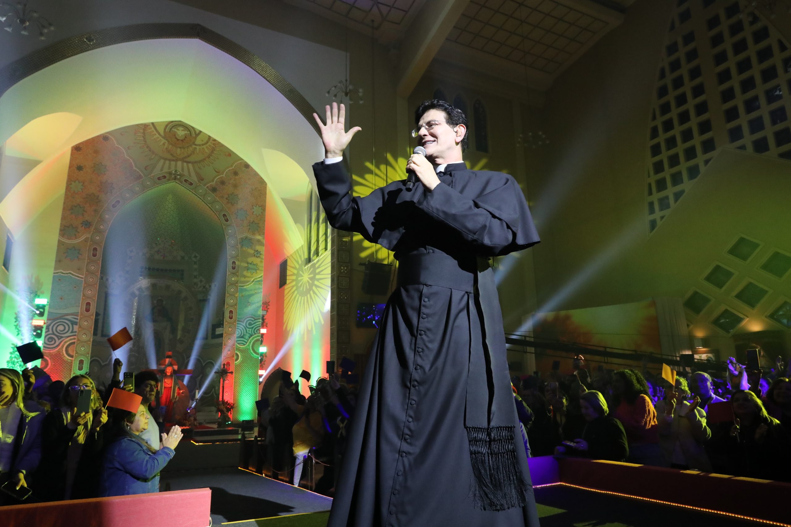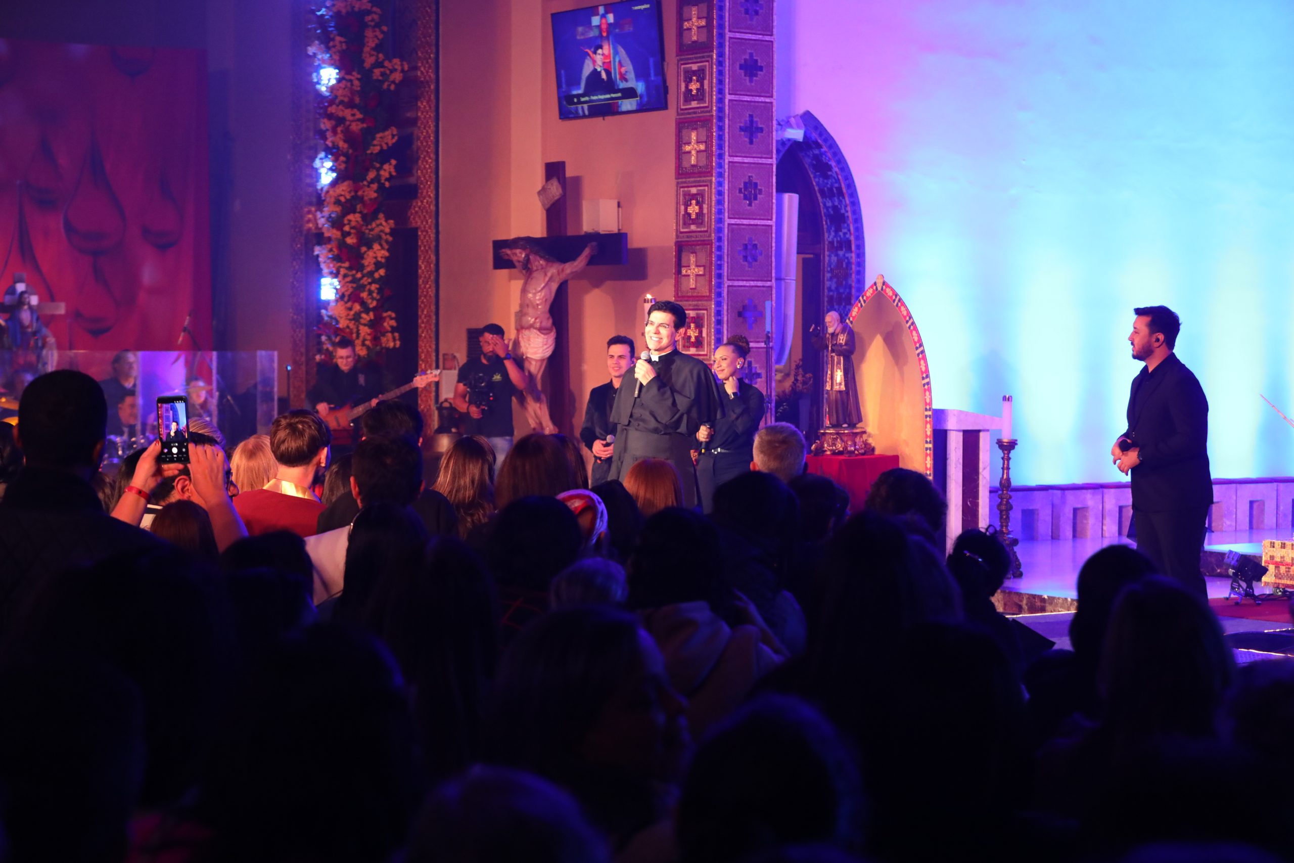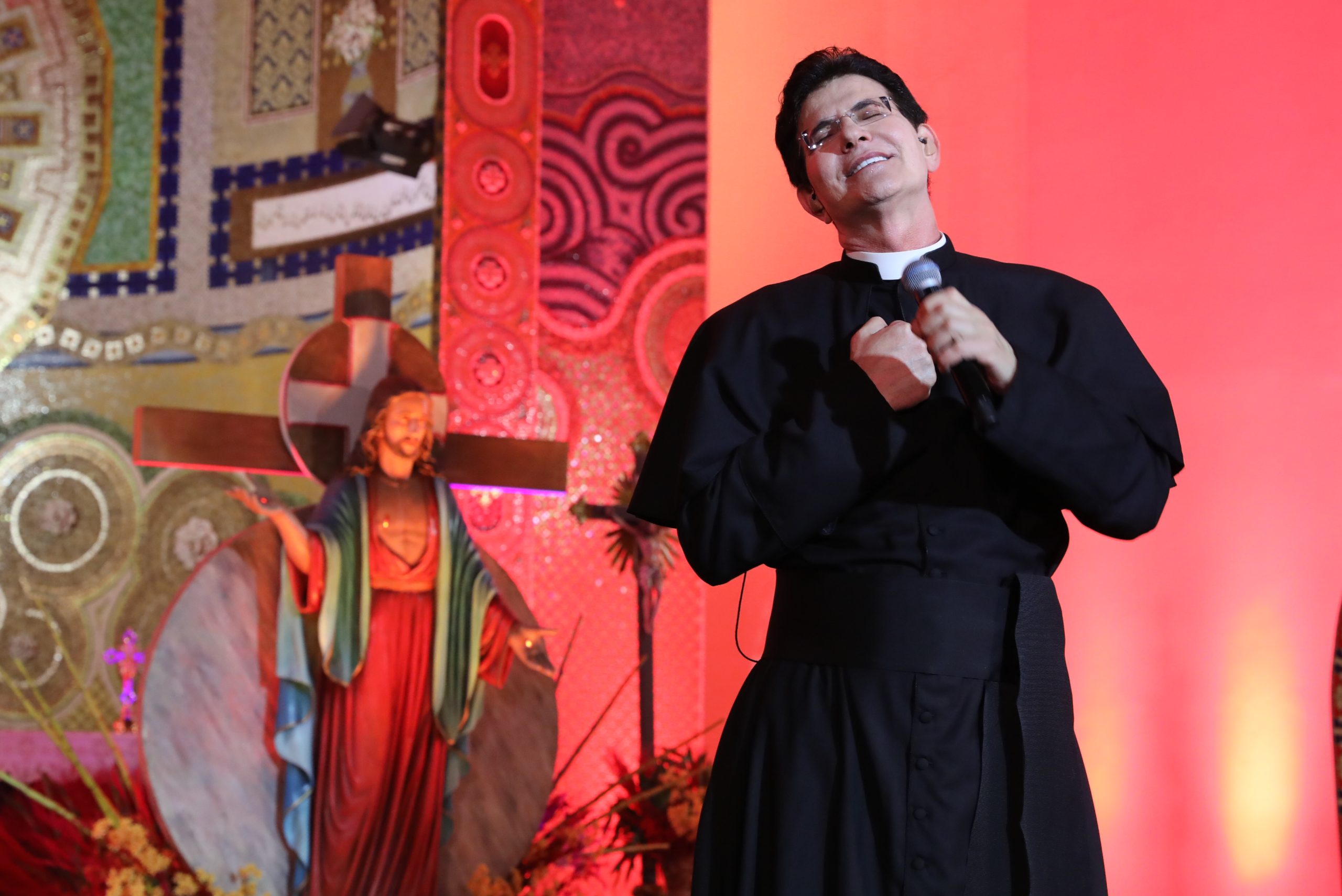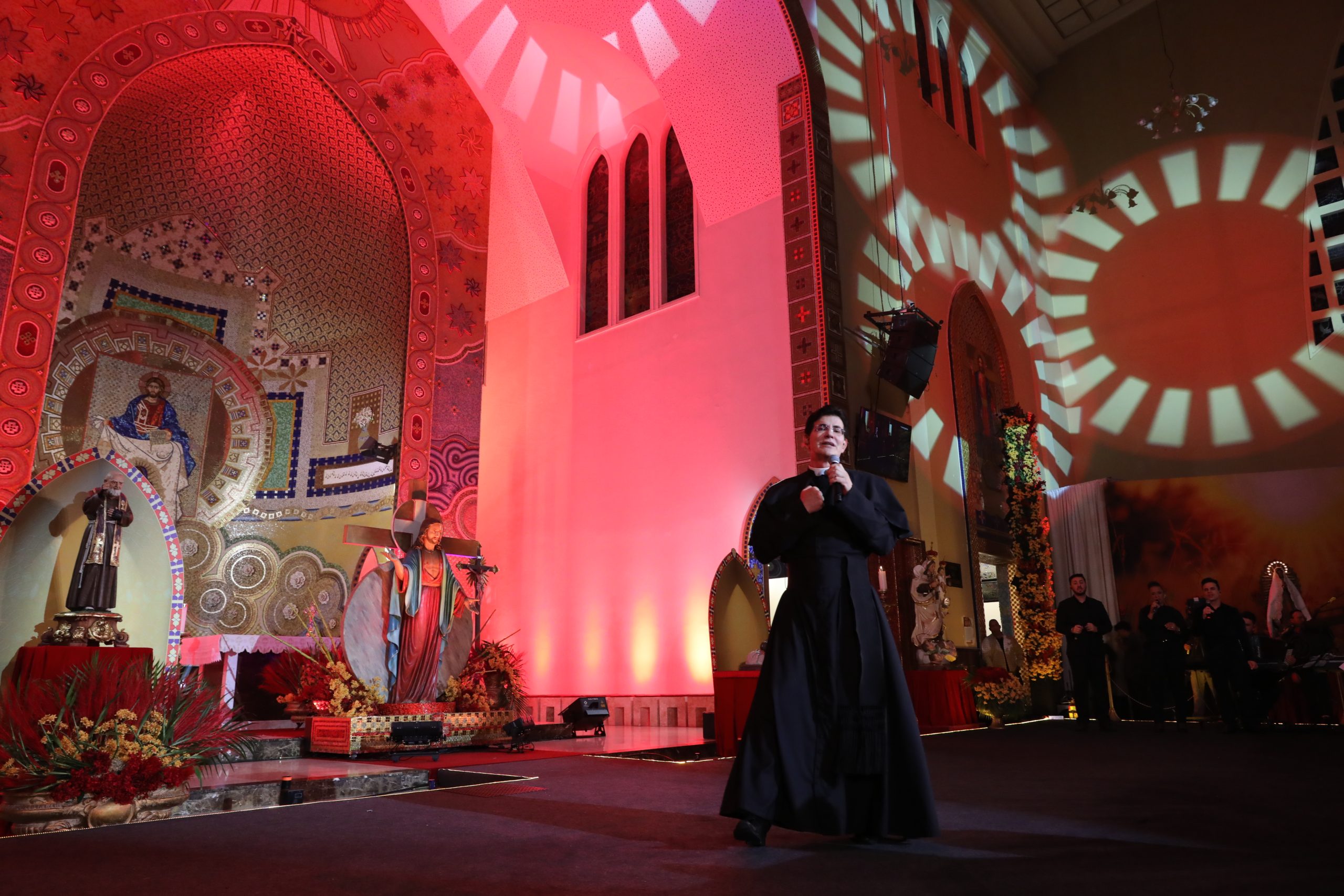 Padre Reginaldo Manzotti recebeu Frei Renan, Padre Ezequiel Dal Pozzo e Joelma Datovo no seu show desta sexta-feira na X Festa das Santas Chagas. O show marcou o início do Jubileu de 20 anos da Associação Evangelizar É Preciso.
