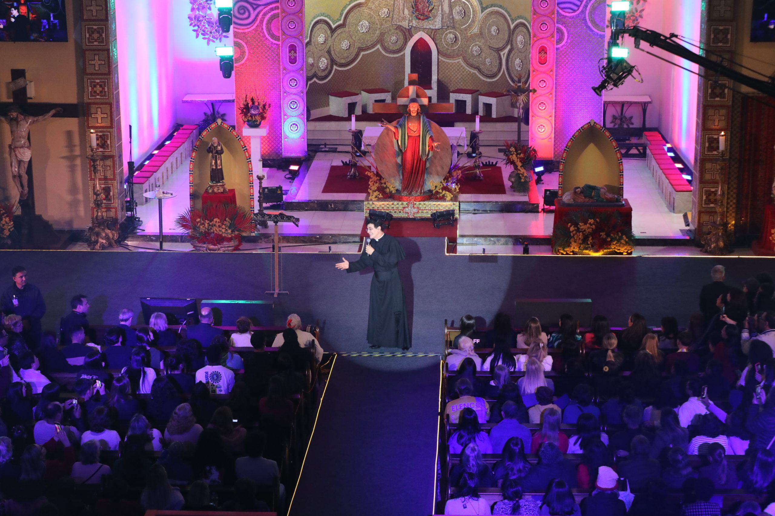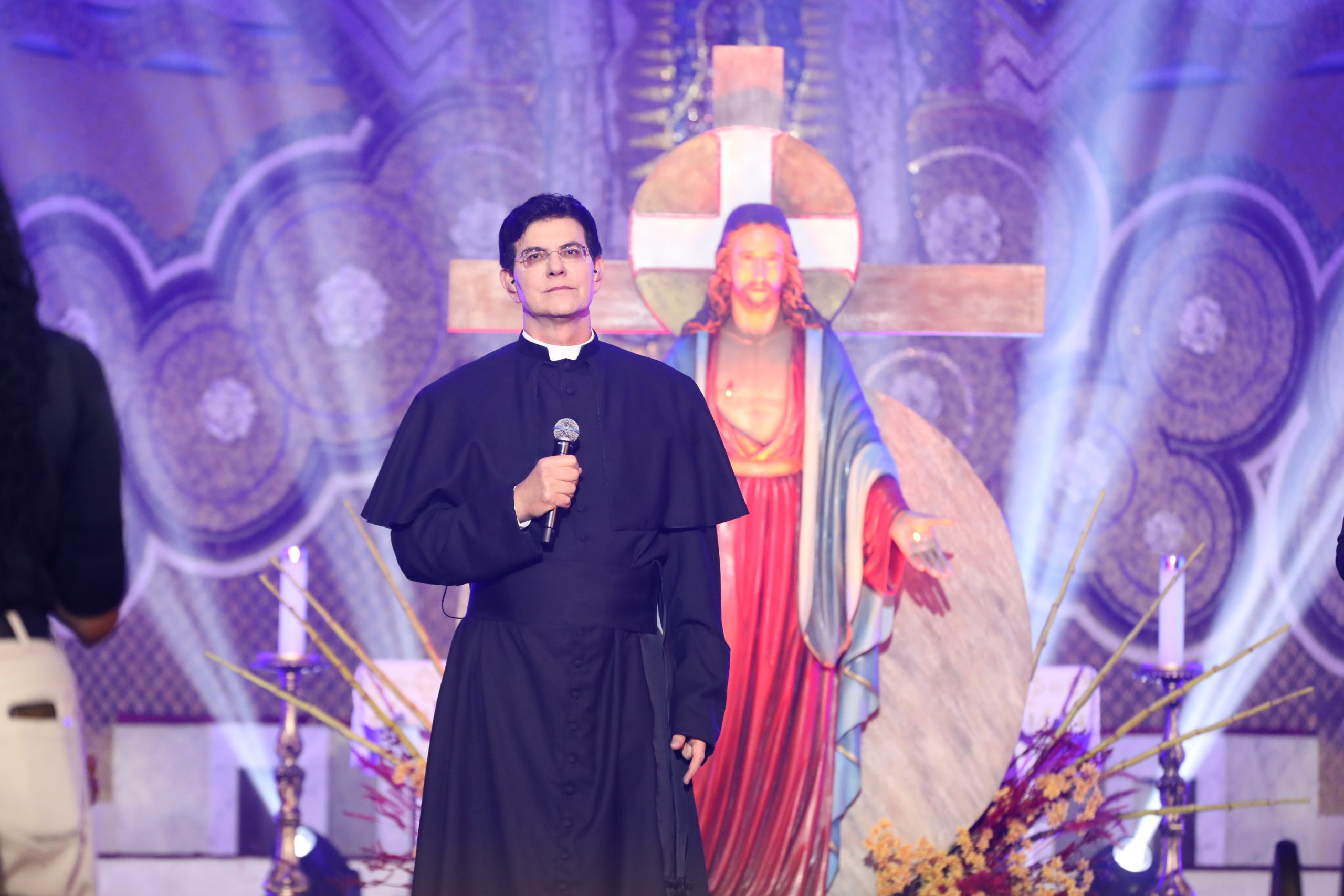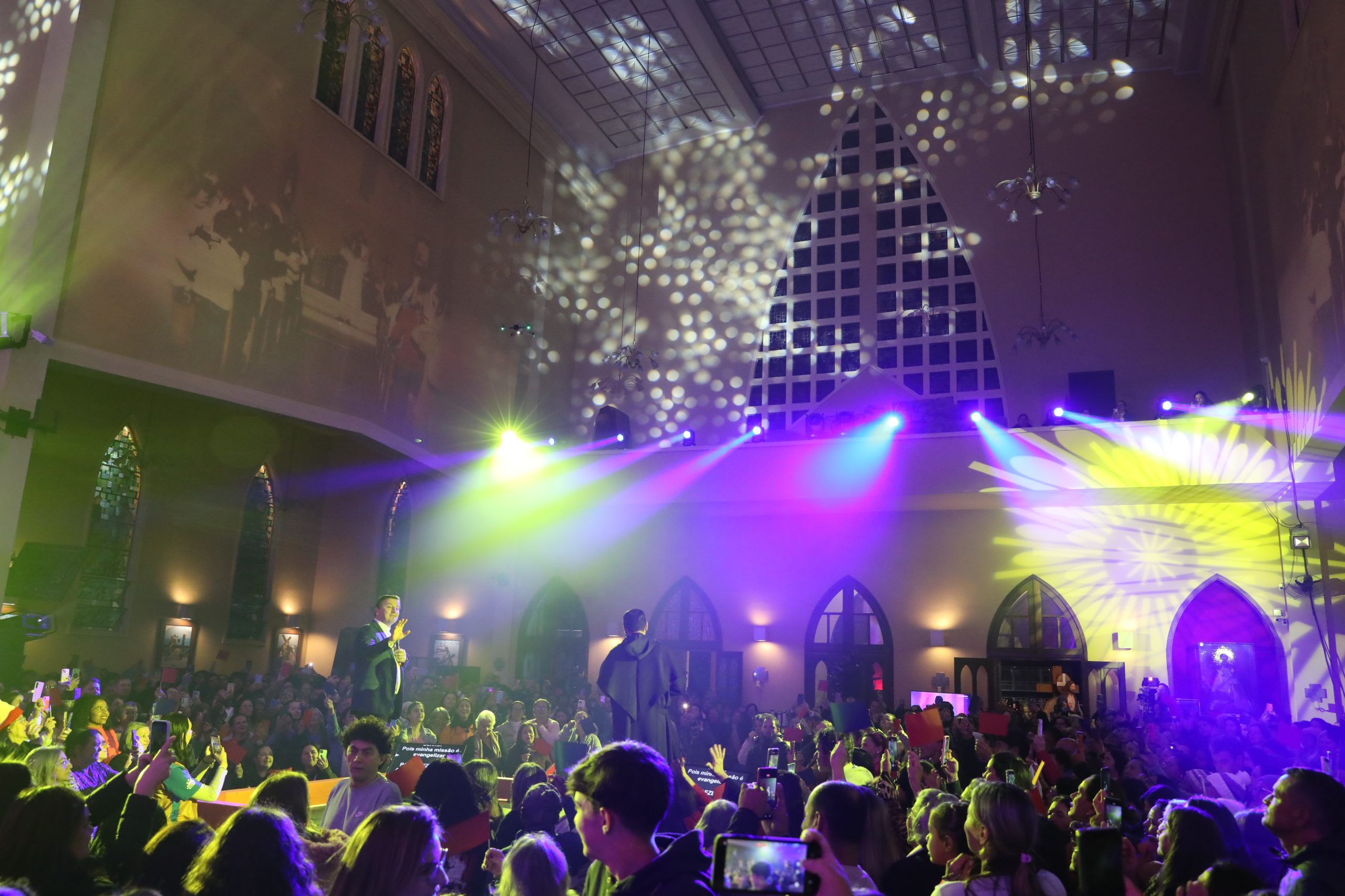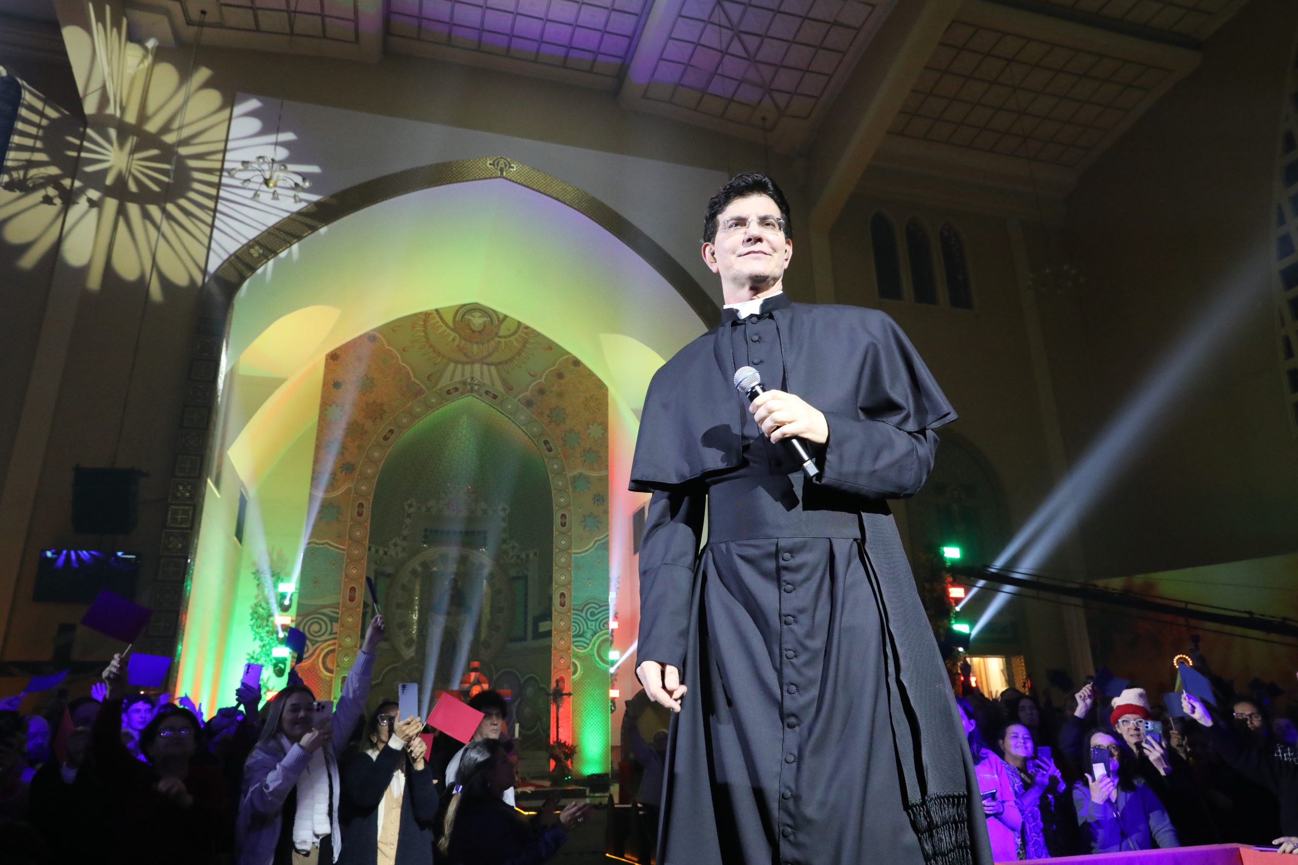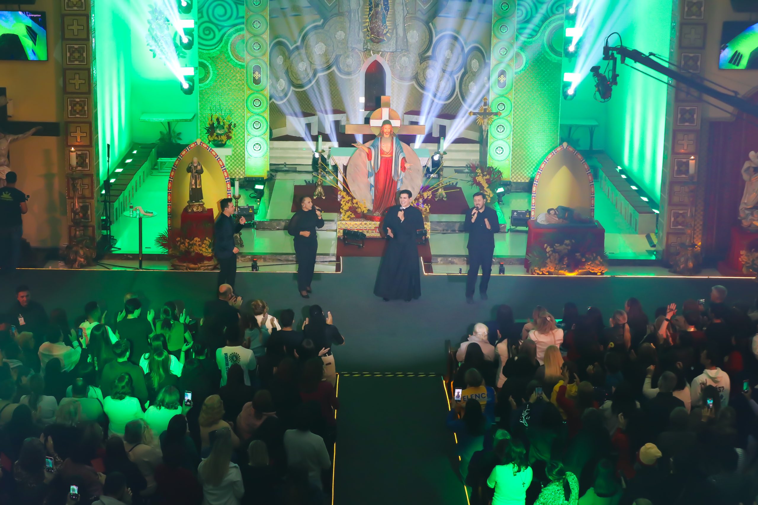 Padre Reginaldo Manzotti recebeu Frei Renan, Padre Ezequiel Dal Pozzo e Joelma Datovo no seu show desta sexta-feira na X Festa das Santas Chagas. O show marcou o início do Jubileu de 20 anos da Associação Evangelizar É Preciso.