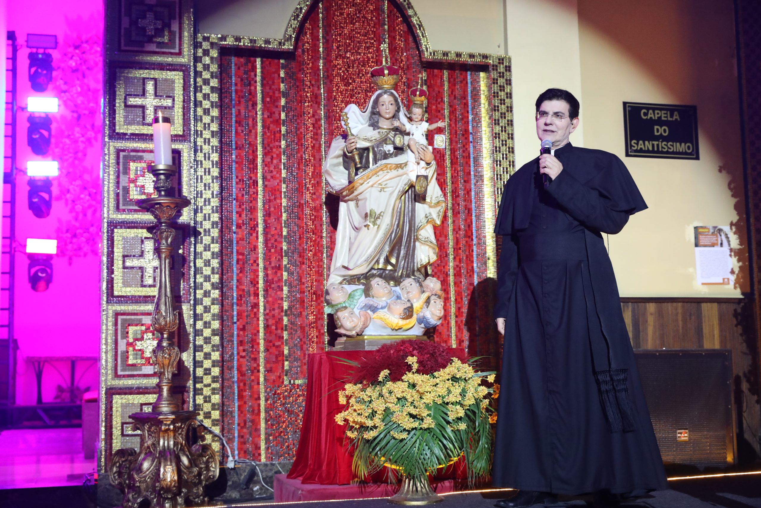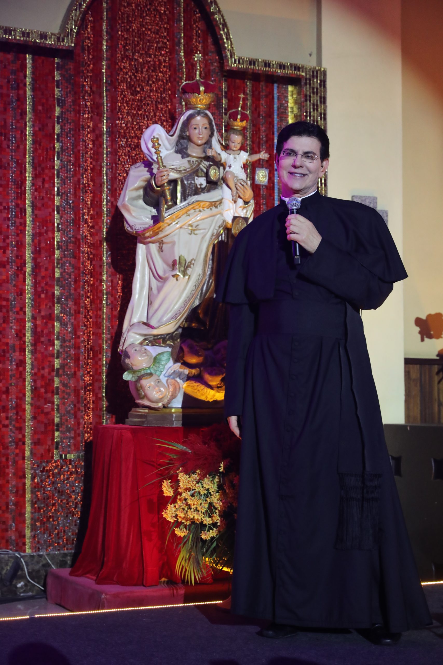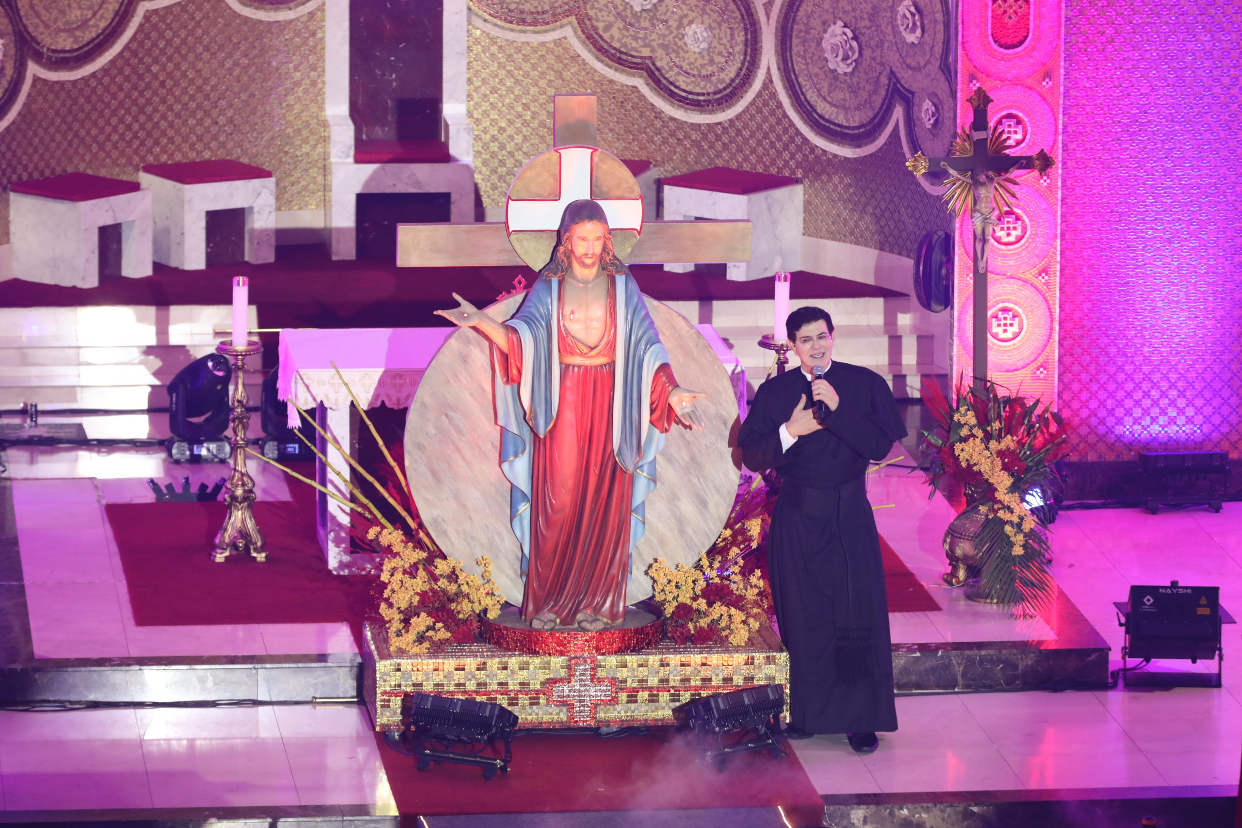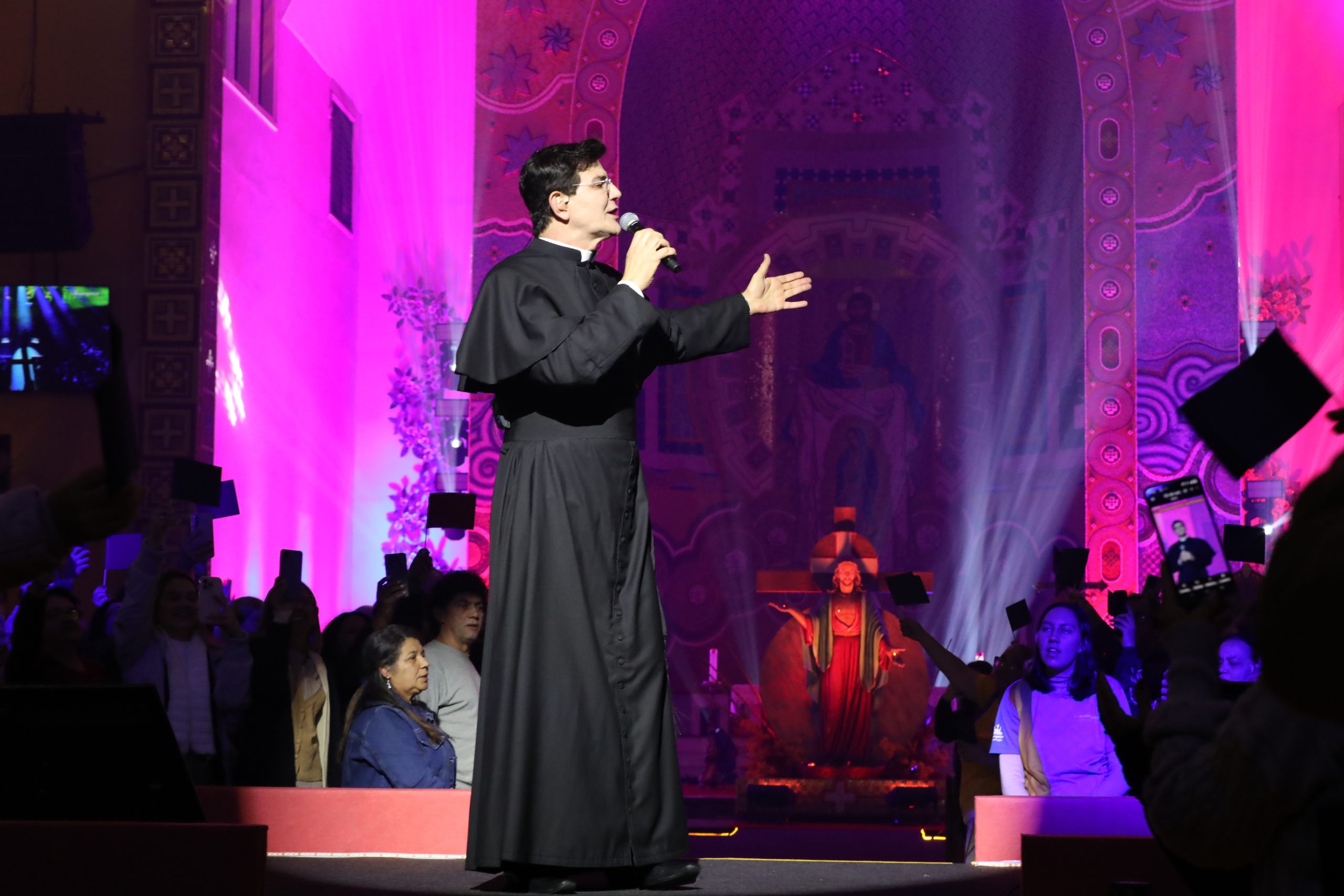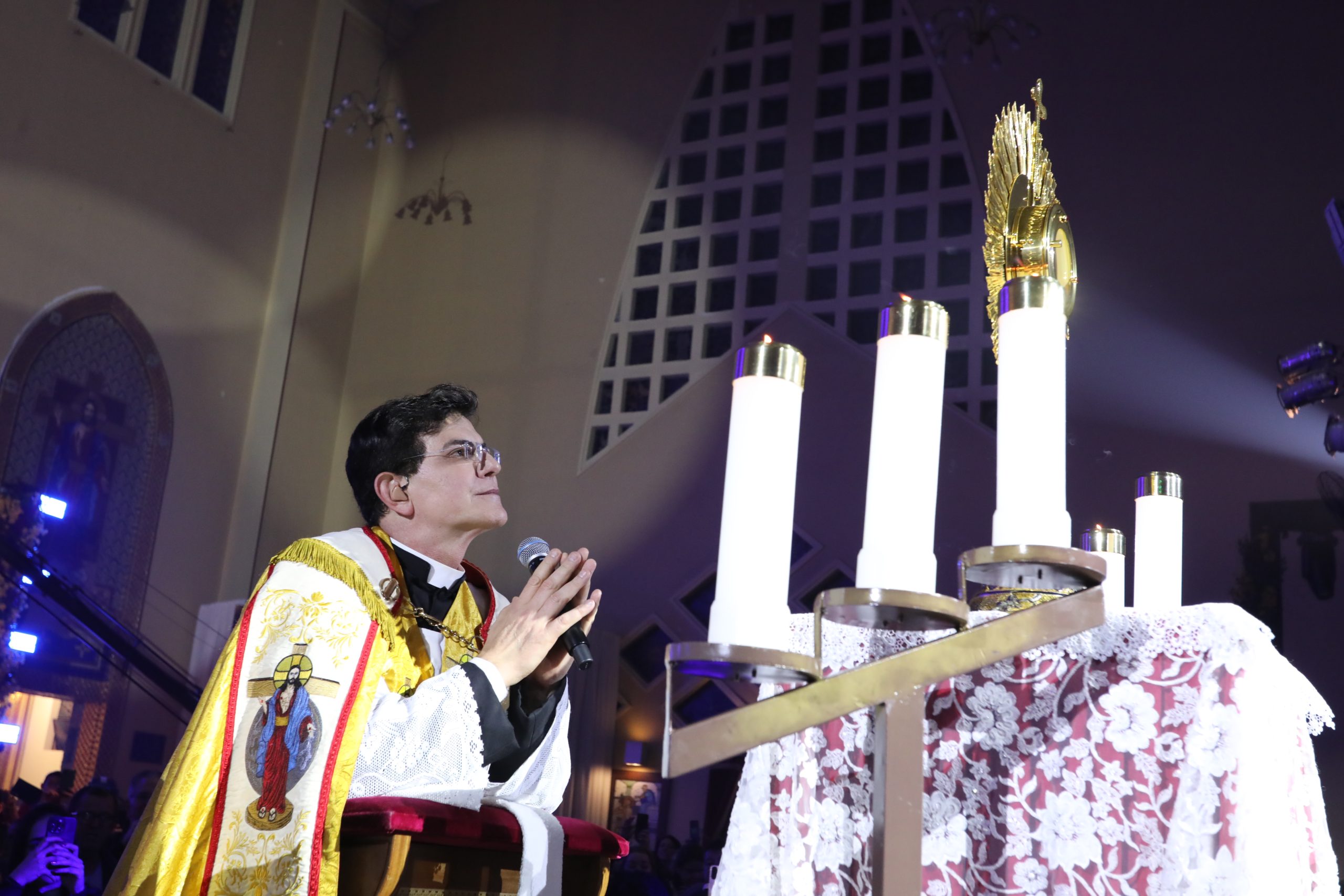 Padre Reginaldo Manzotti recebeu Frei Renan, Padre Ezequiel Dal Pozzo e Joelma Datovo no seu show desta sexta-feira na X Festa das Santas Chagas. O show marcou o início do Jubileu de 20 anos da Associação Evangelizar É Preciso.