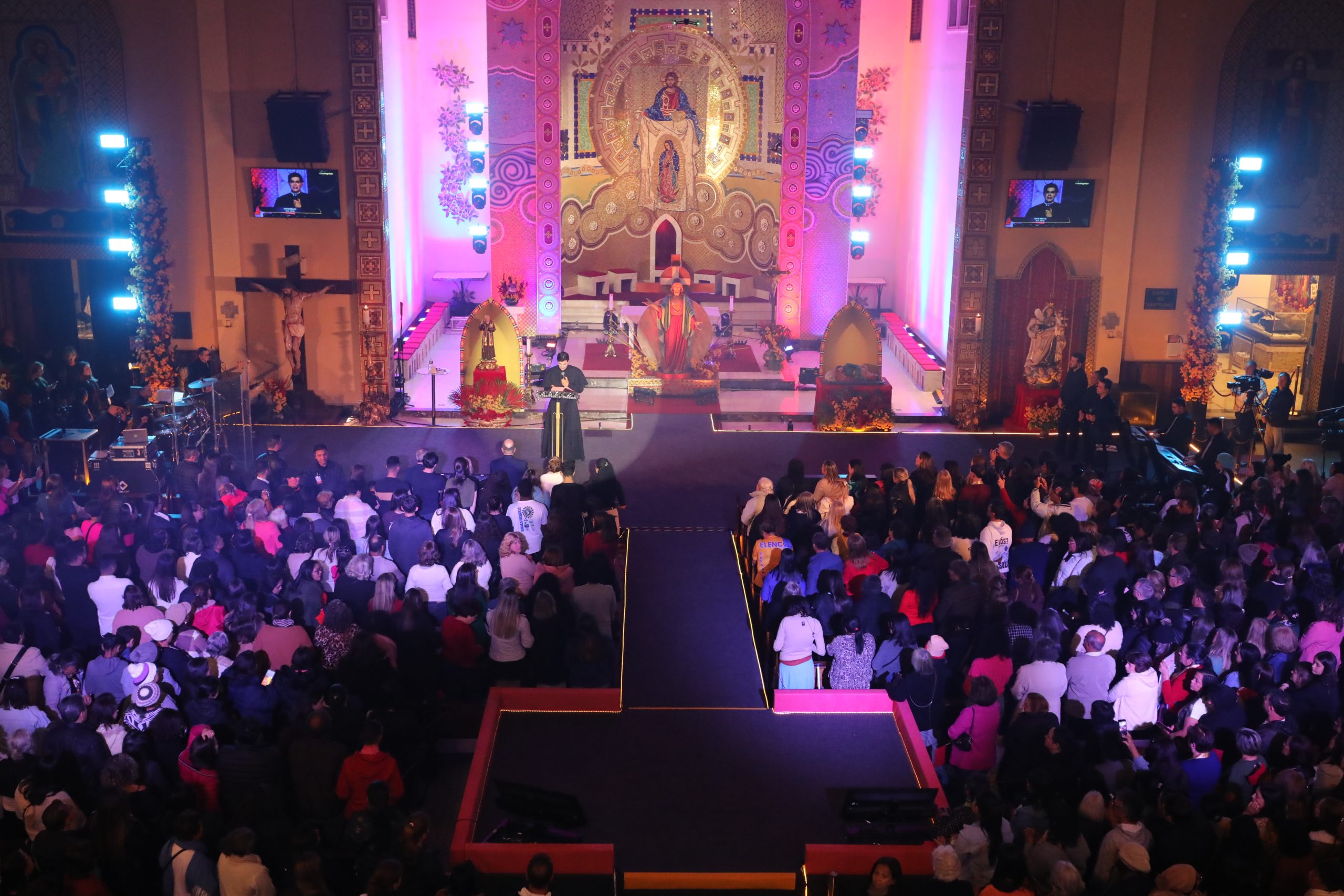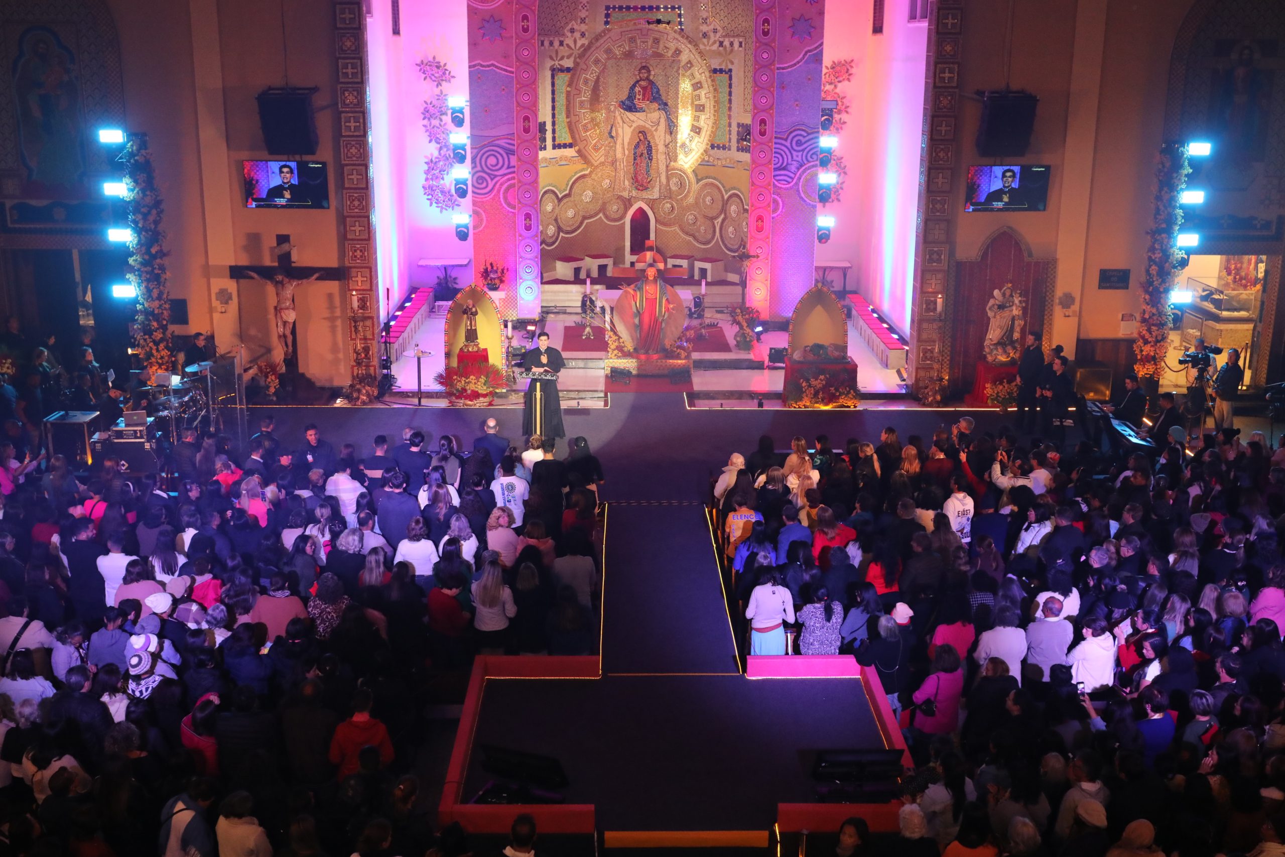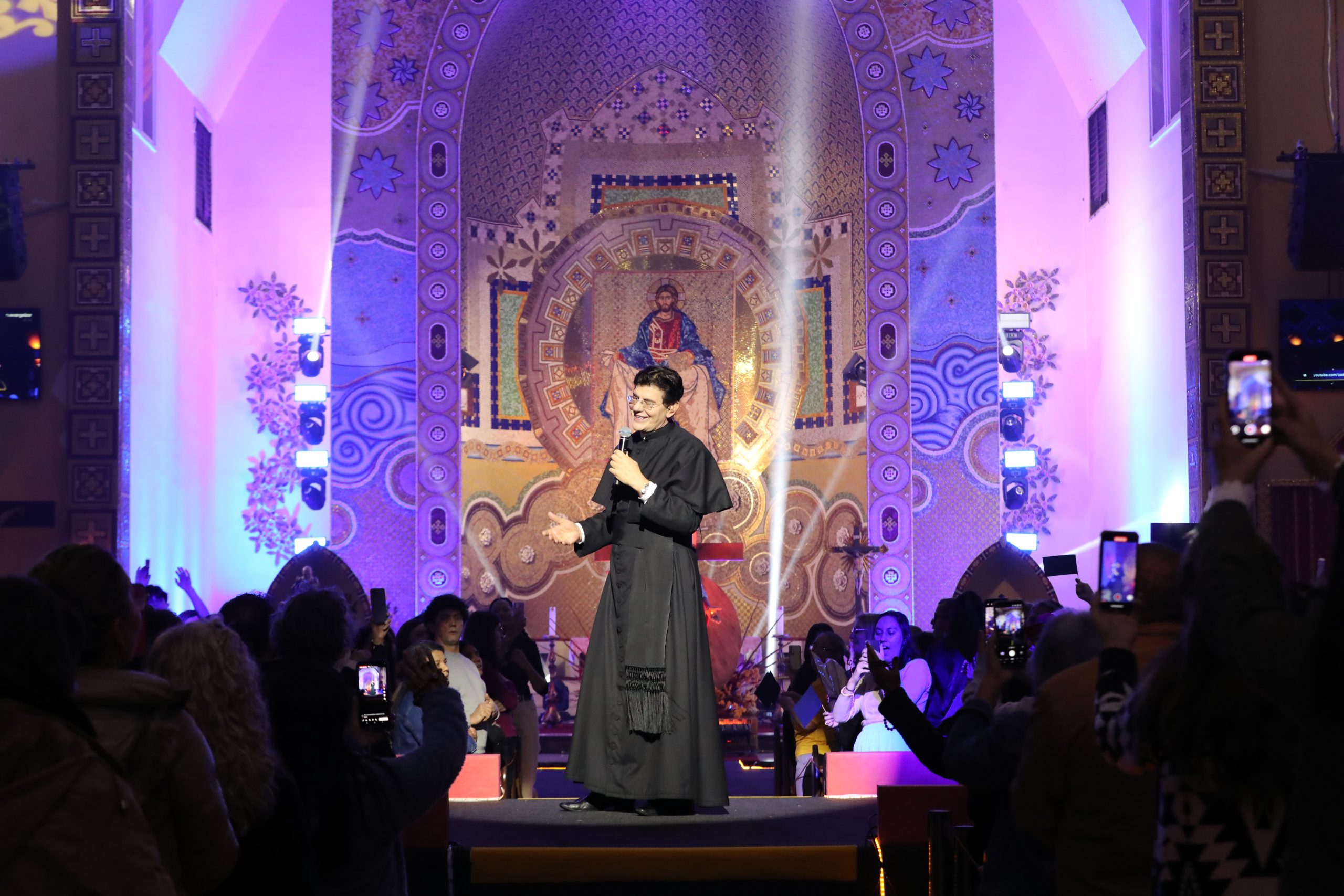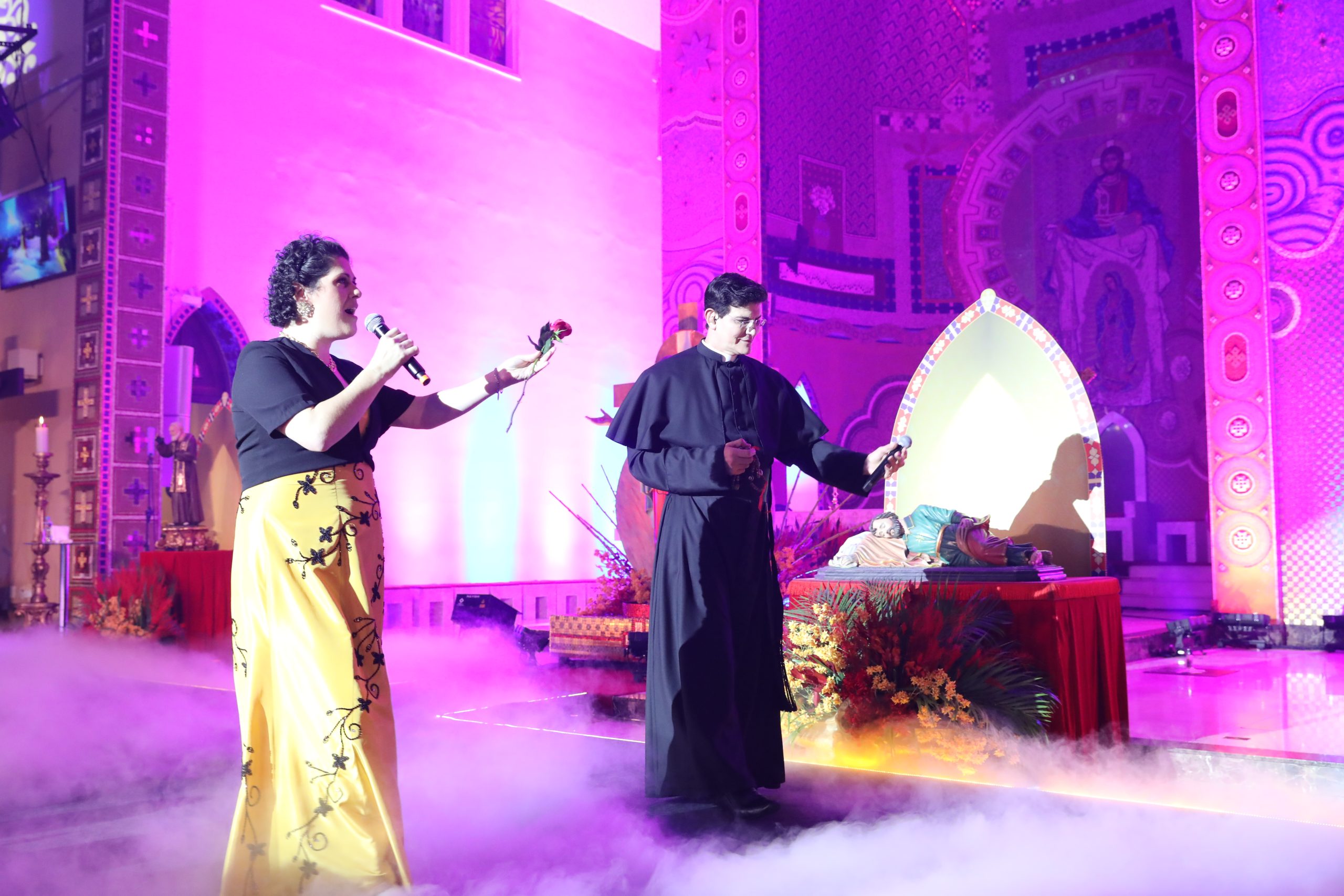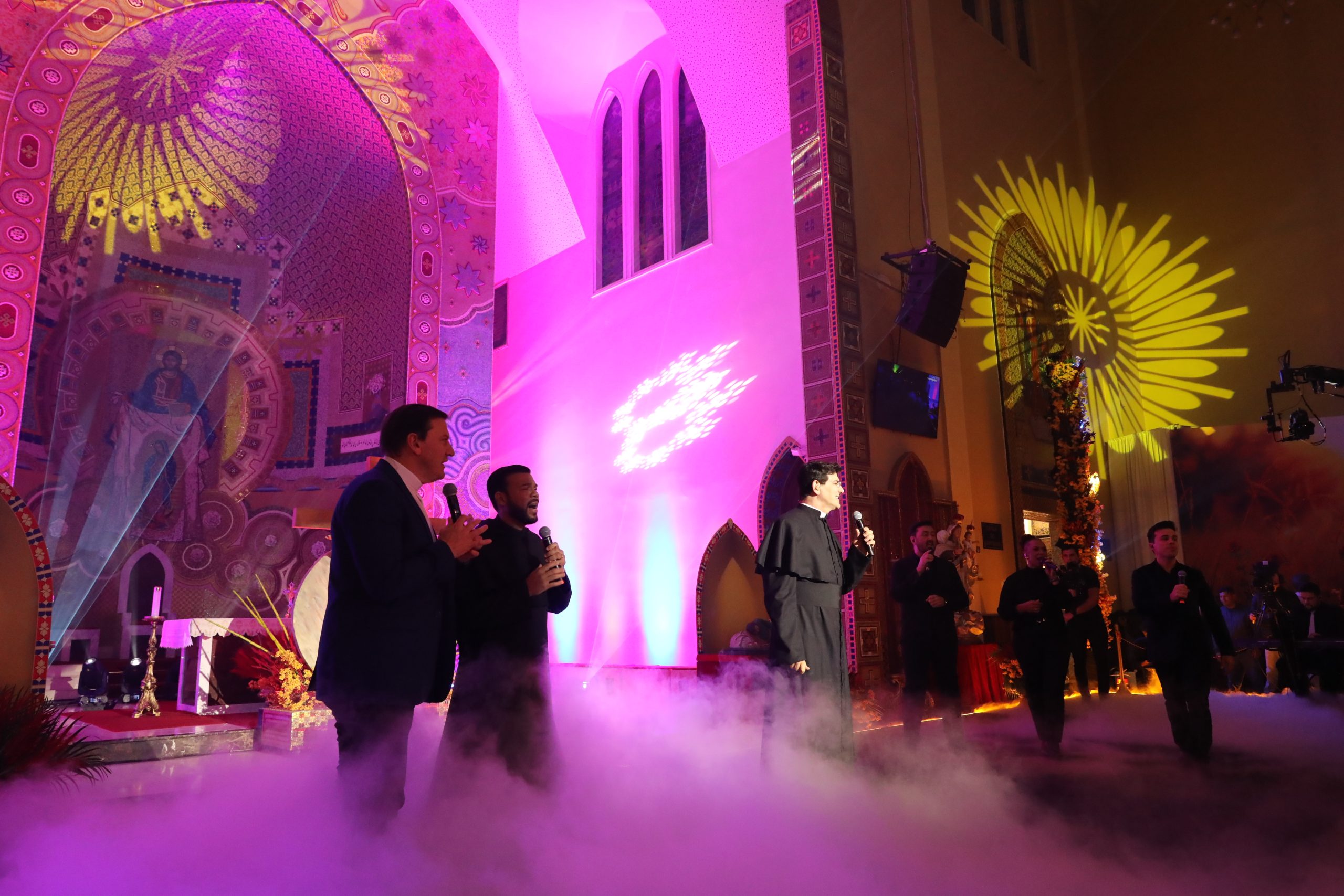 Padre Reginaldo Manzotti recebeu Frei Renan, Padre Ezequiel Dal Pozzo e Joelma Datovo no seu show desta sexta-feira na X Festa das Santas Chagas. O show marcou o início do Jubileu de 20 anos da Associação Evangelizar É Preciso.