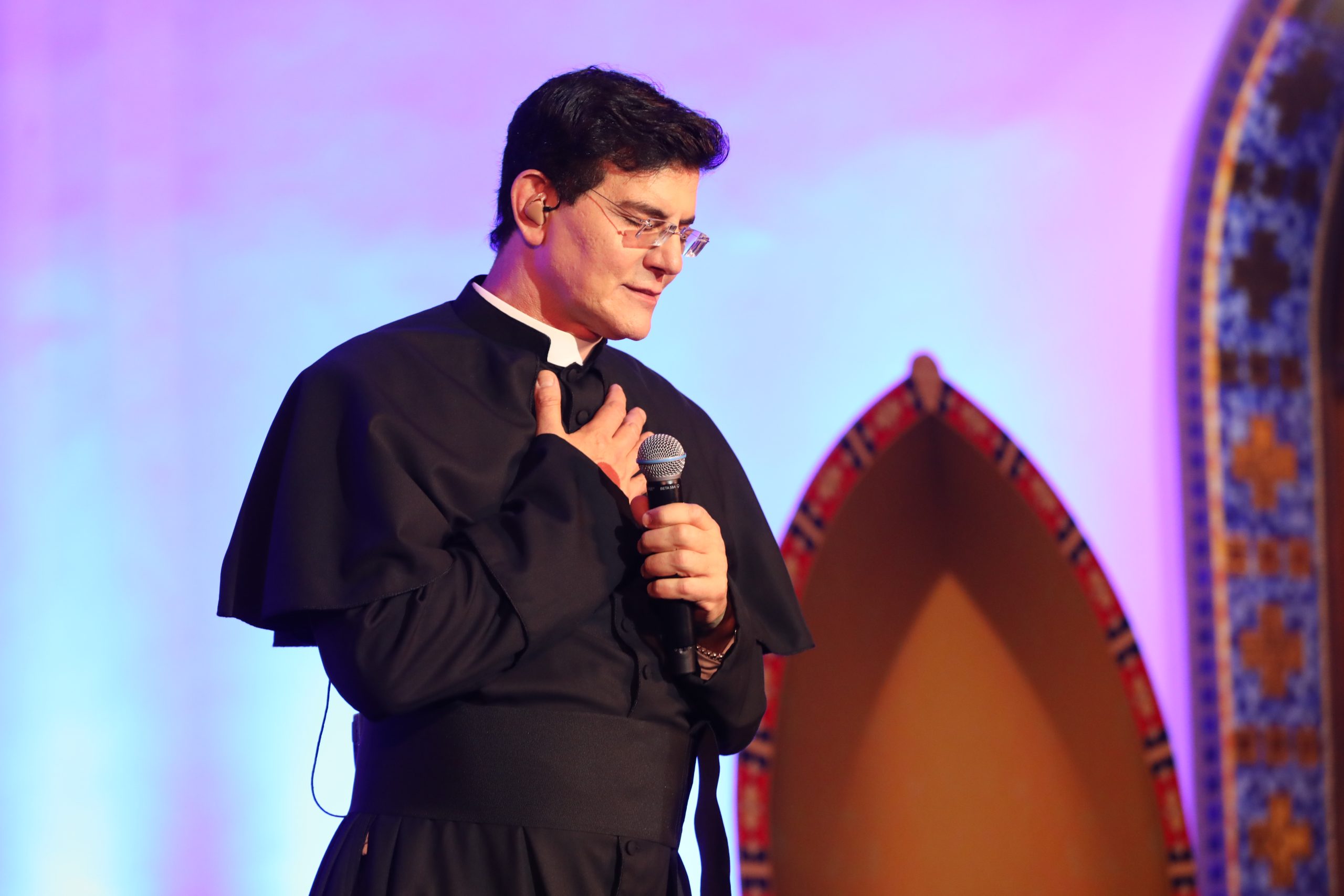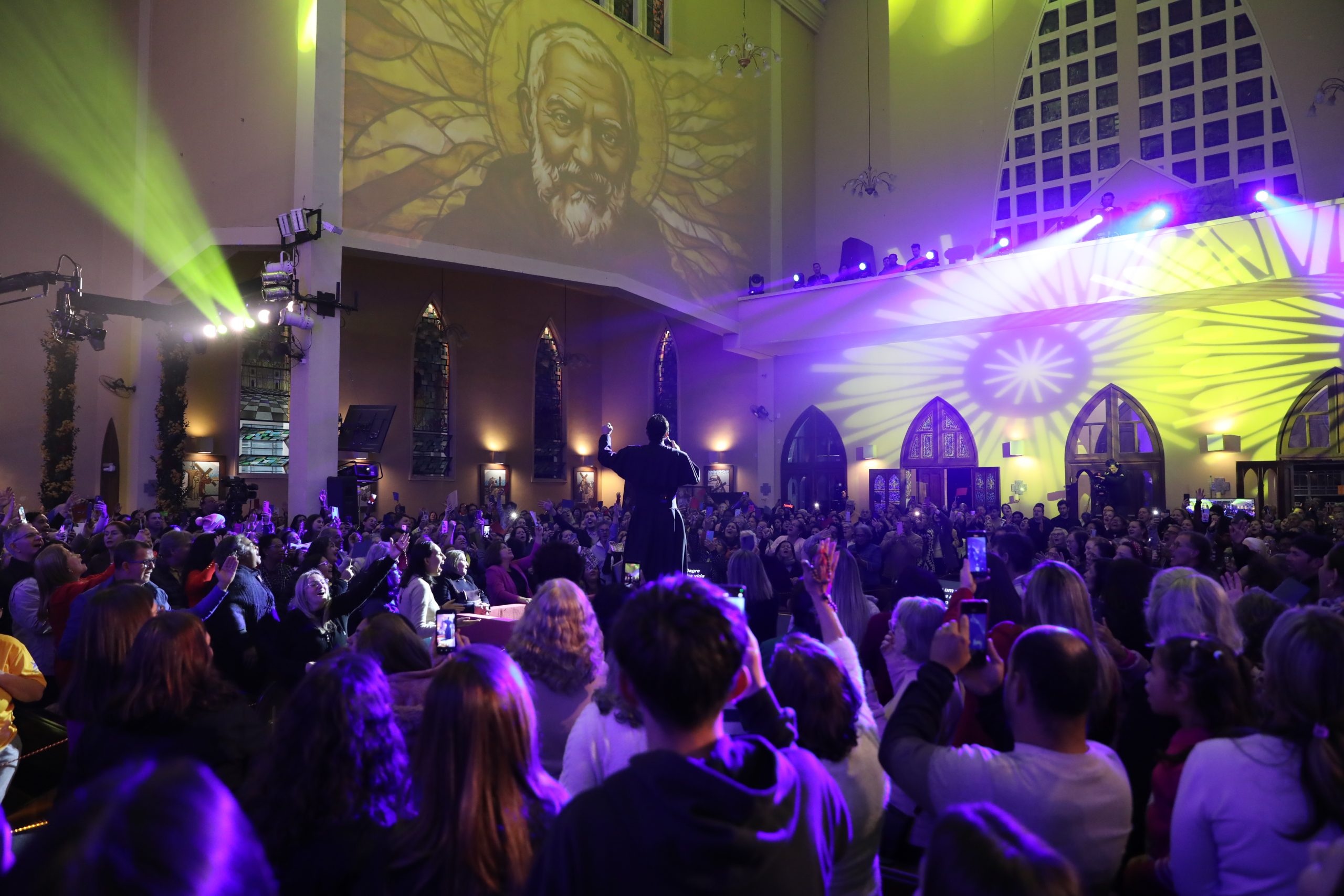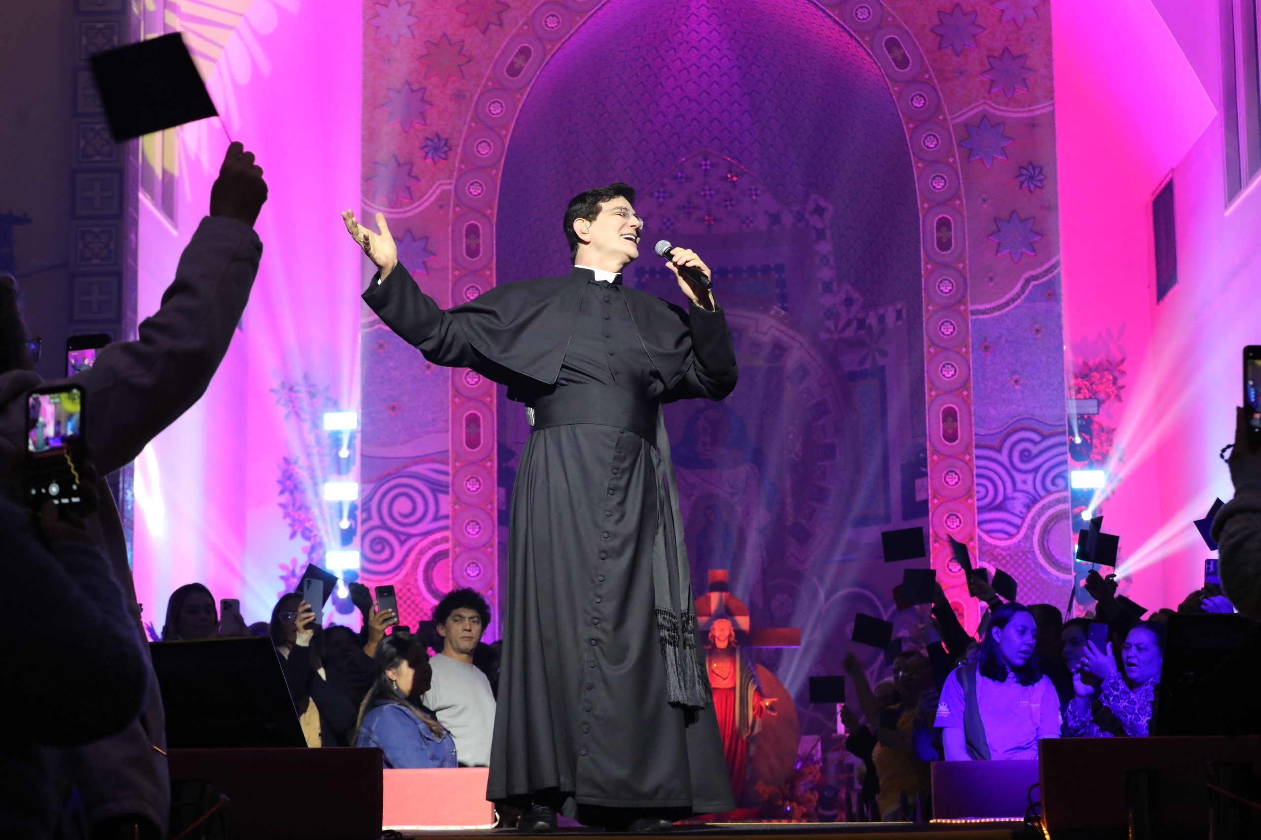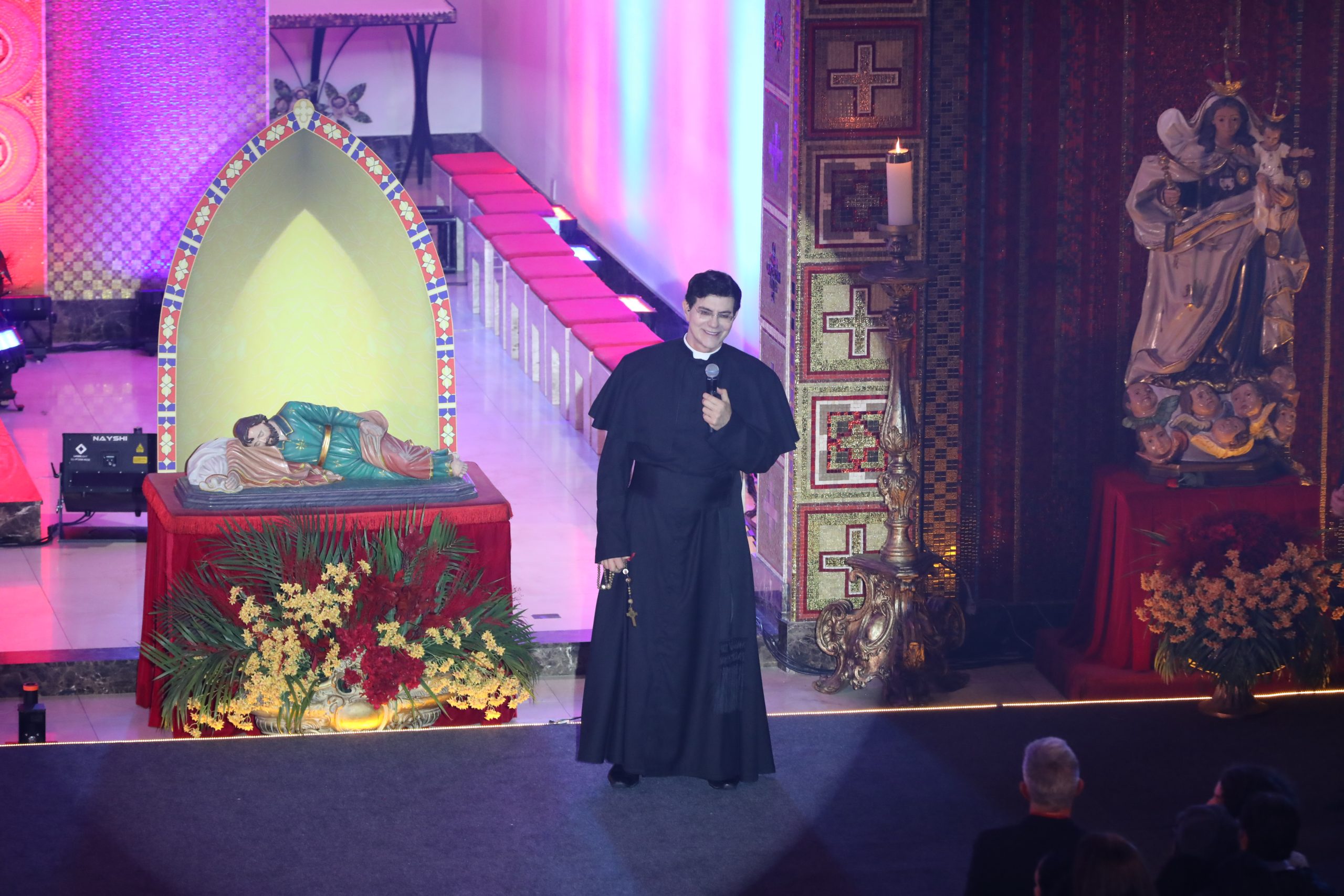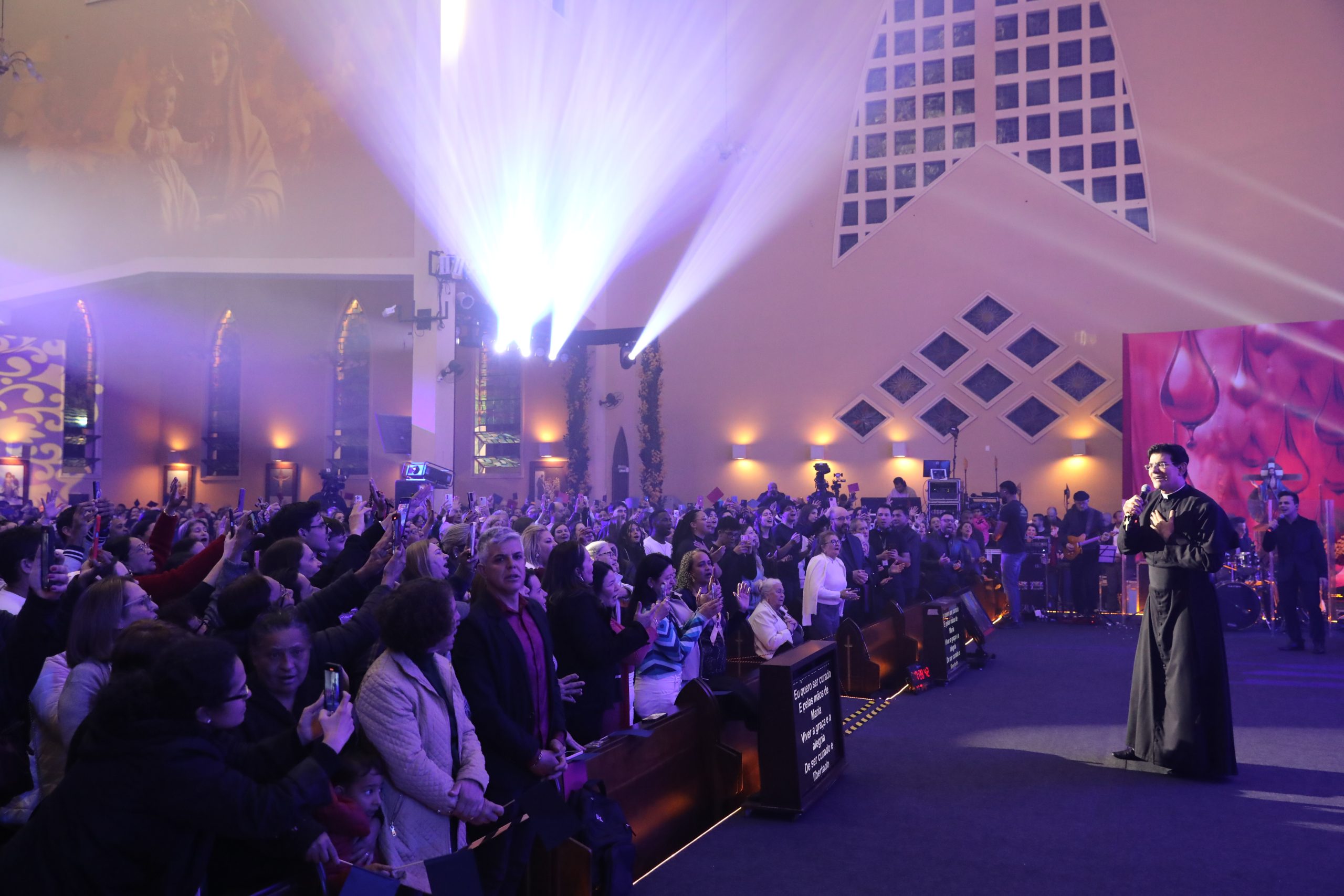 Padre Reginaldo Manzotti recebeu Frei Renan, Padre Ezequiel Dal Pozzo e Joelma Datovo no seu show desta sexta-feira na X Festa das Santas Chagas. O show marcou o início do Jubileu de 20 anos da Associação Evangelizar É Preciso.