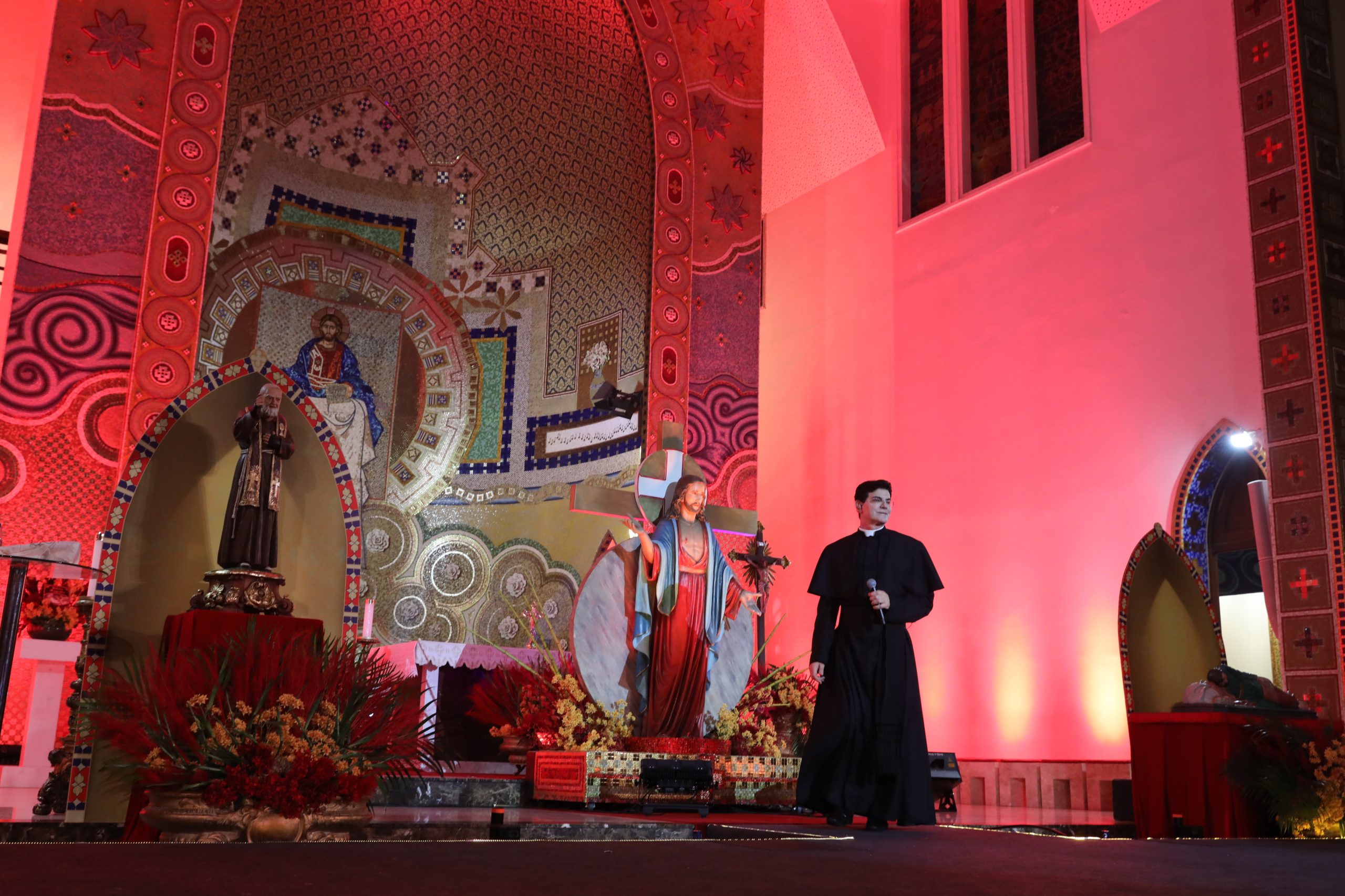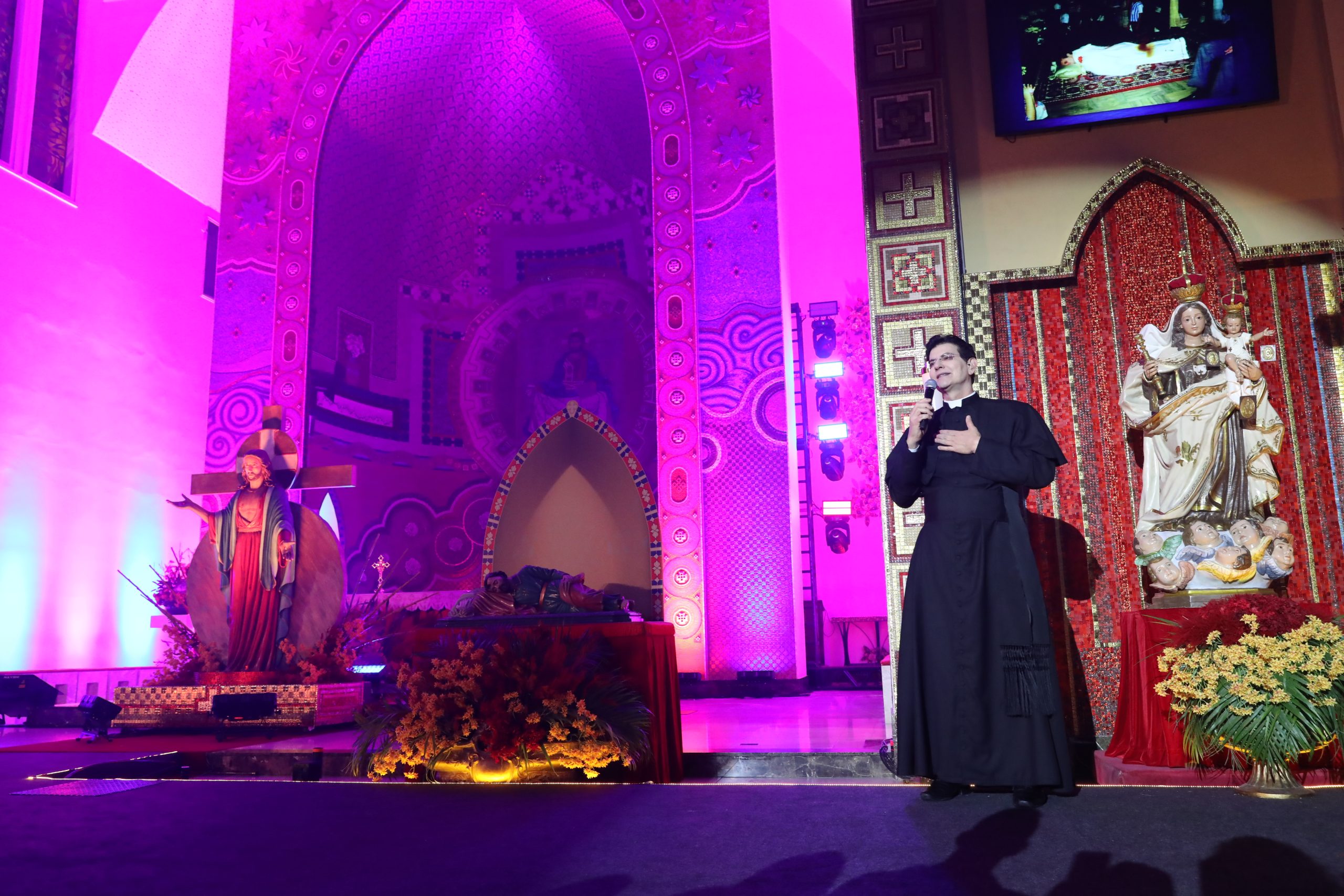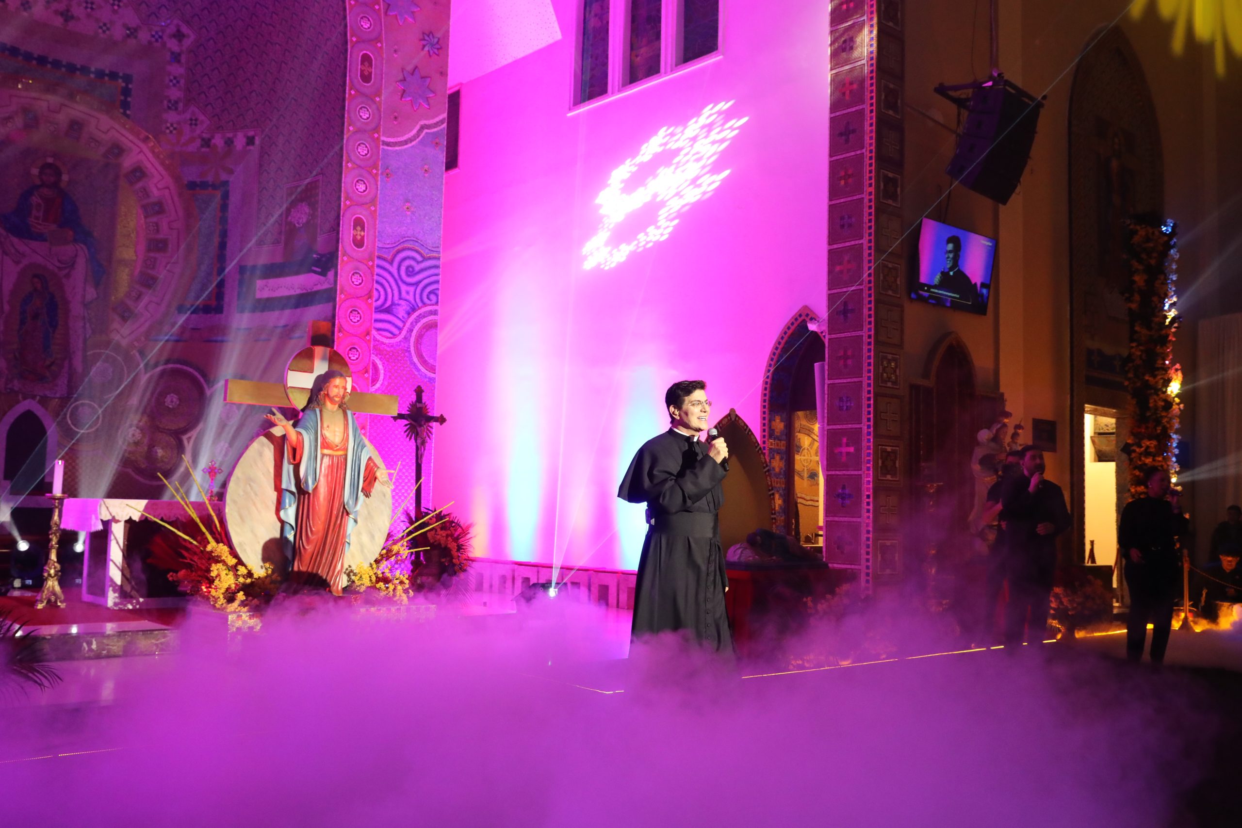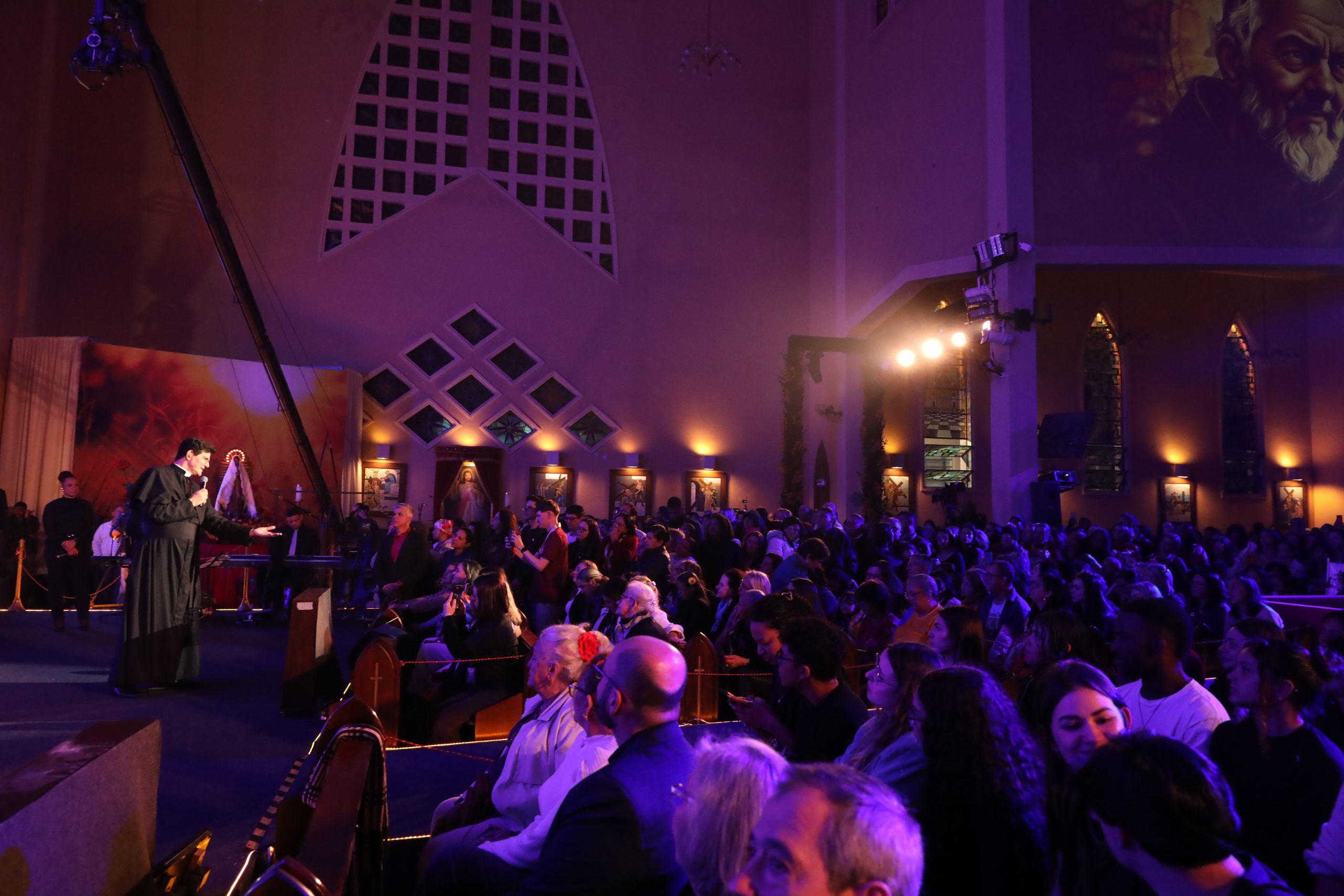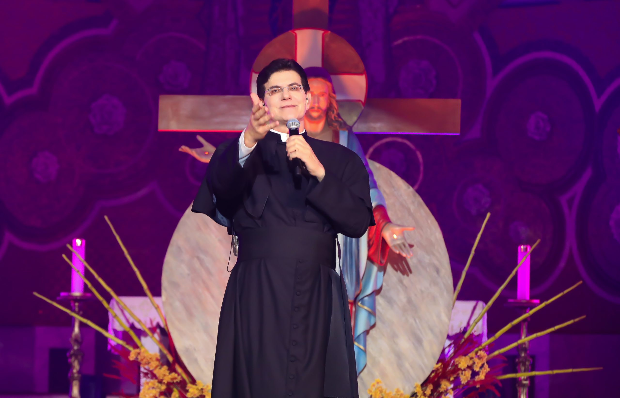 Padre Reginaldo Manzotti recebeu Frei Renan, Padre Ezequiel Dal Pozzo e Joelma Datovo no seu show desta sexta-feira na X Festa das Santas Chagas. O show marcou o início do Jubileu de 20 anos da Associação Evangelizar É Preciso.