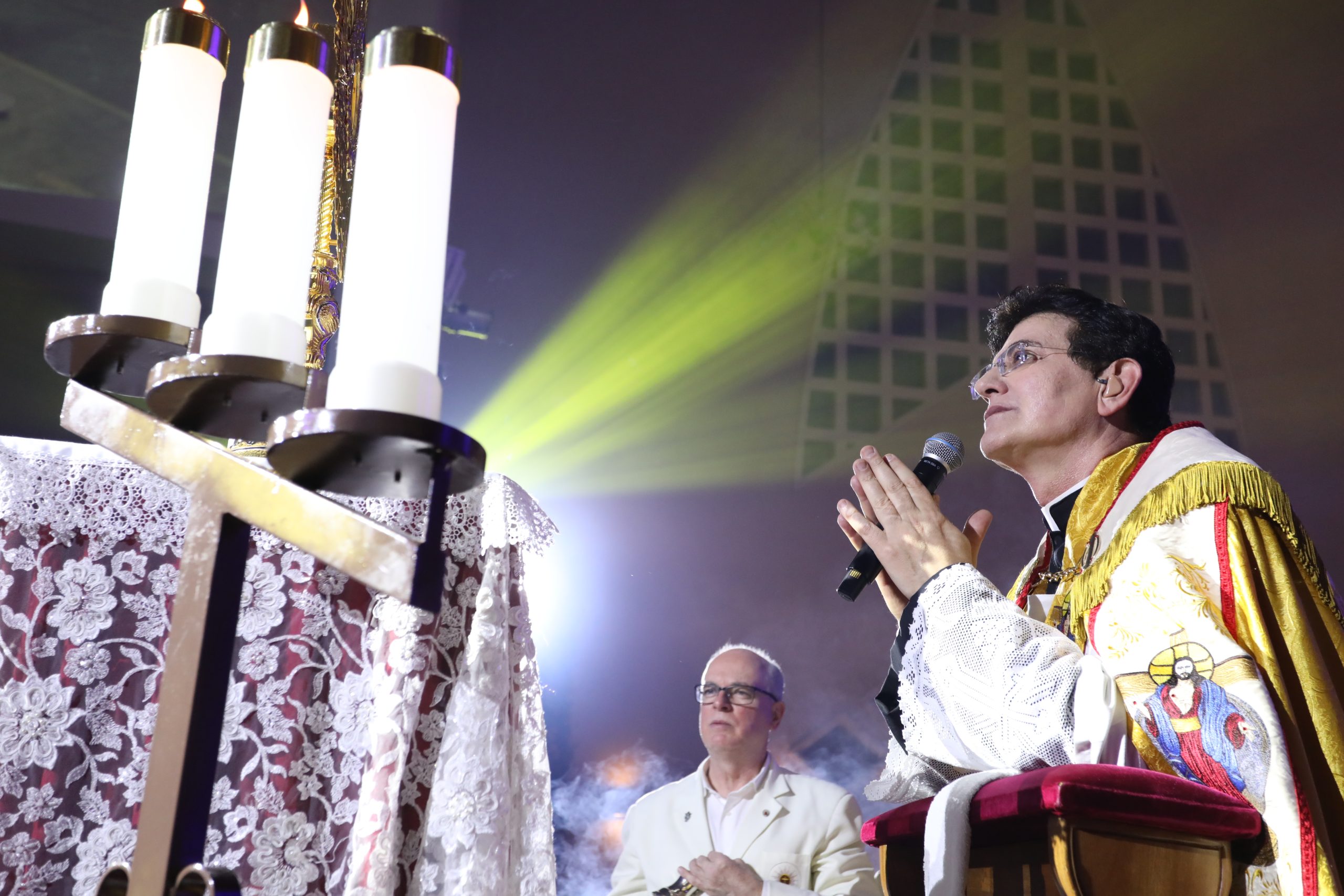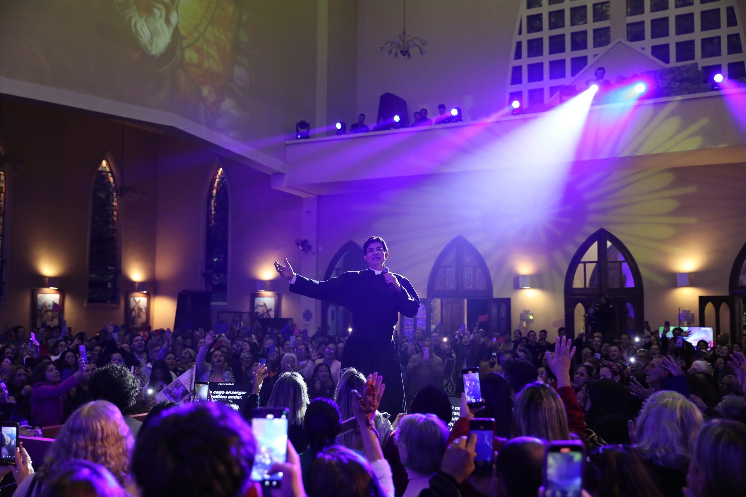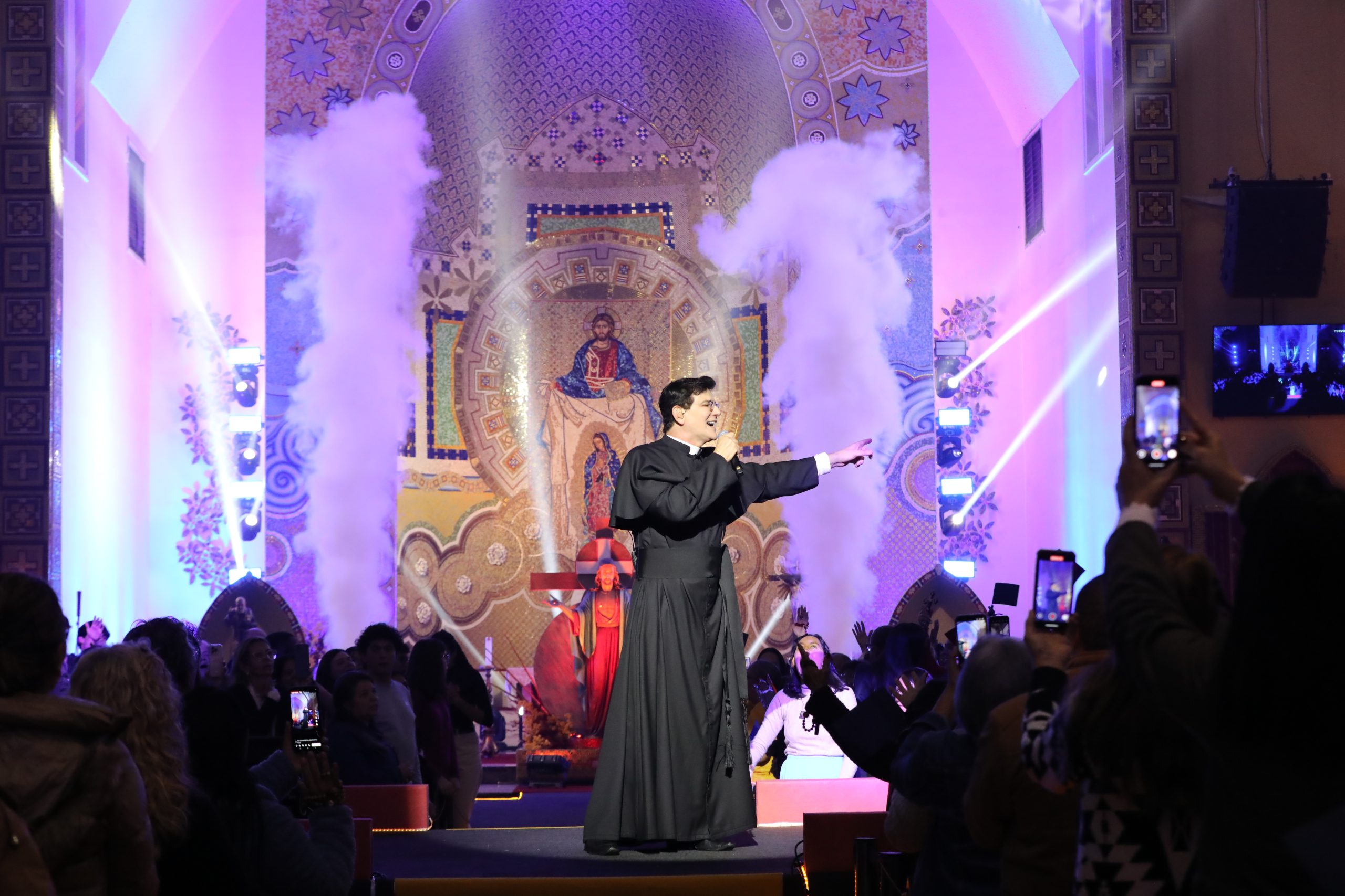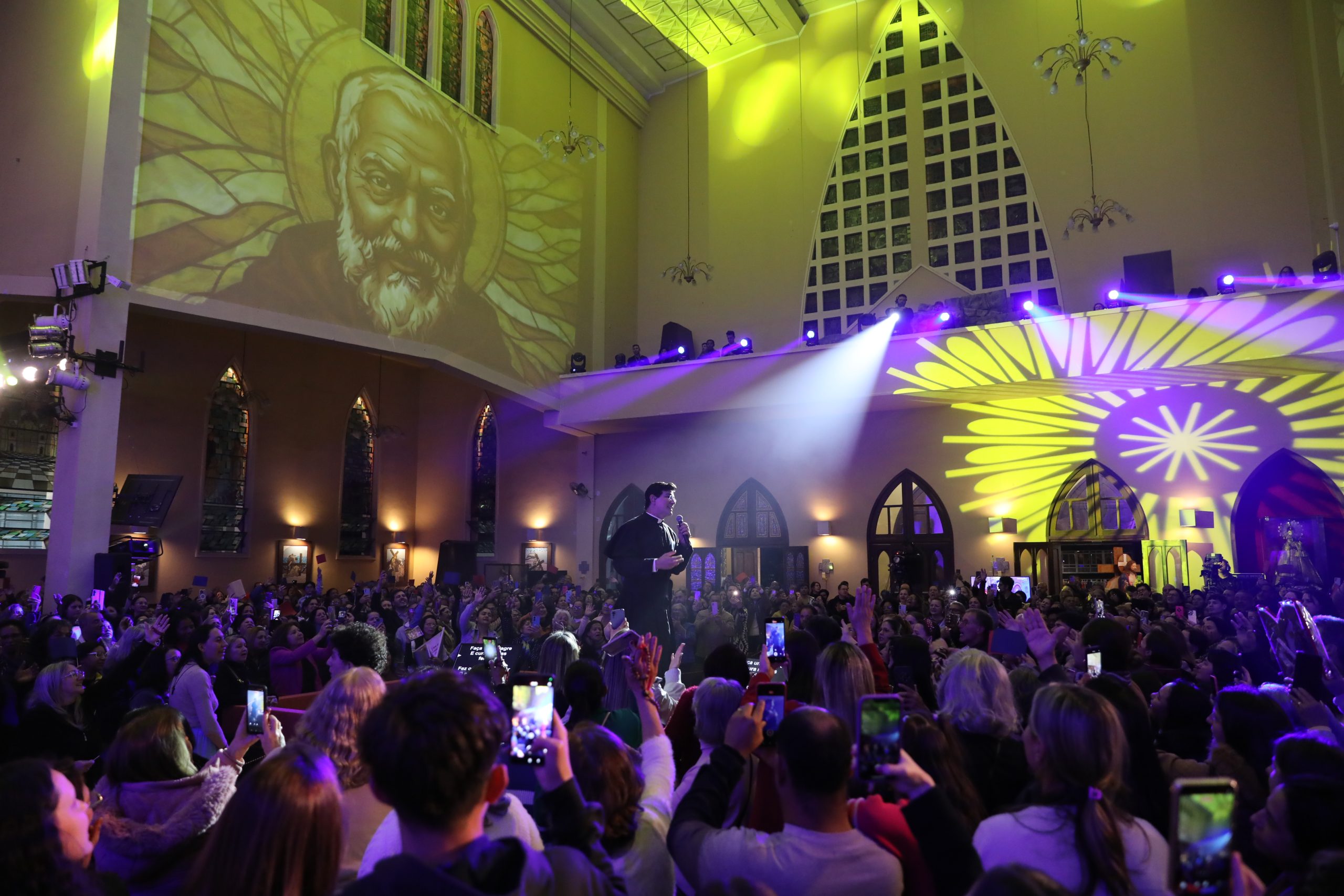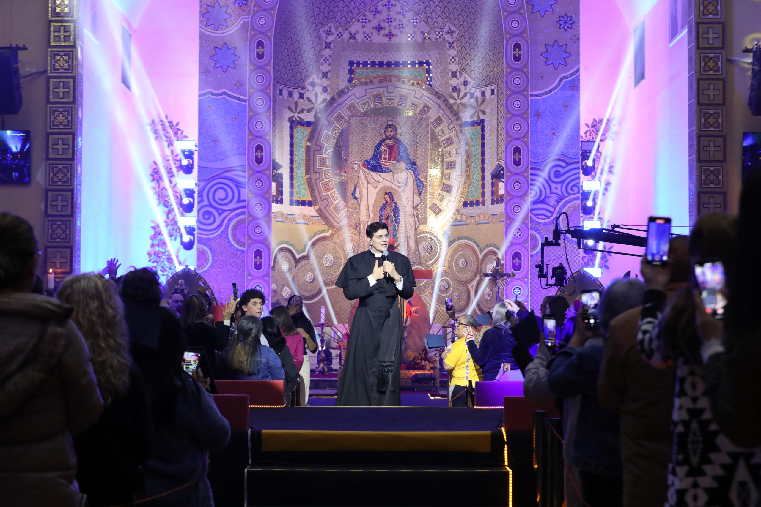 Padre Reginaldo Manzotti recebeu Frei Renan, Padre Ezequiel Dal Pozzo e Joelma Datovo no seu show desta sexta-feira na X Festa das Santas Chagas. O show marcou o início do Jubileu de 20 anos da Associação Evangelizar É Preciso.
