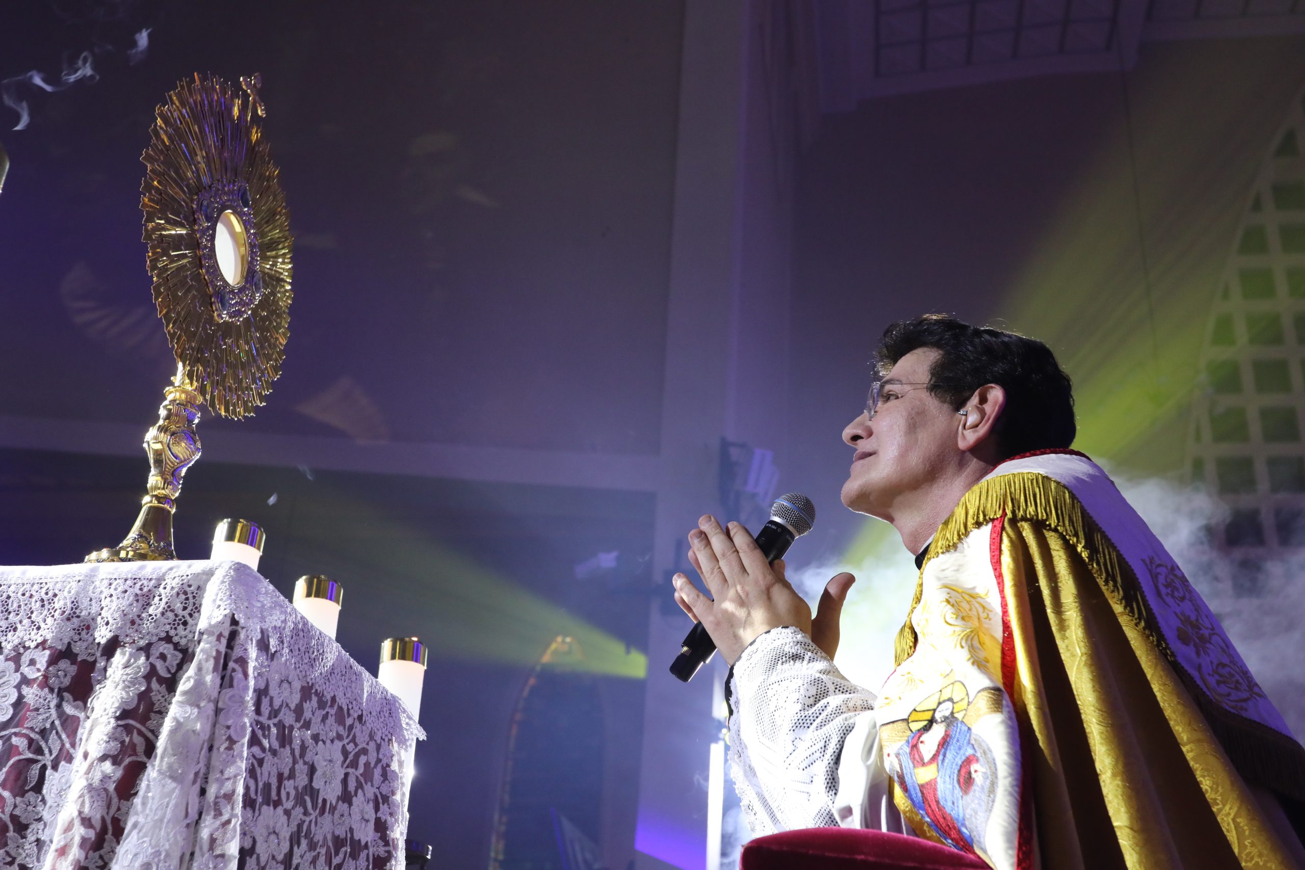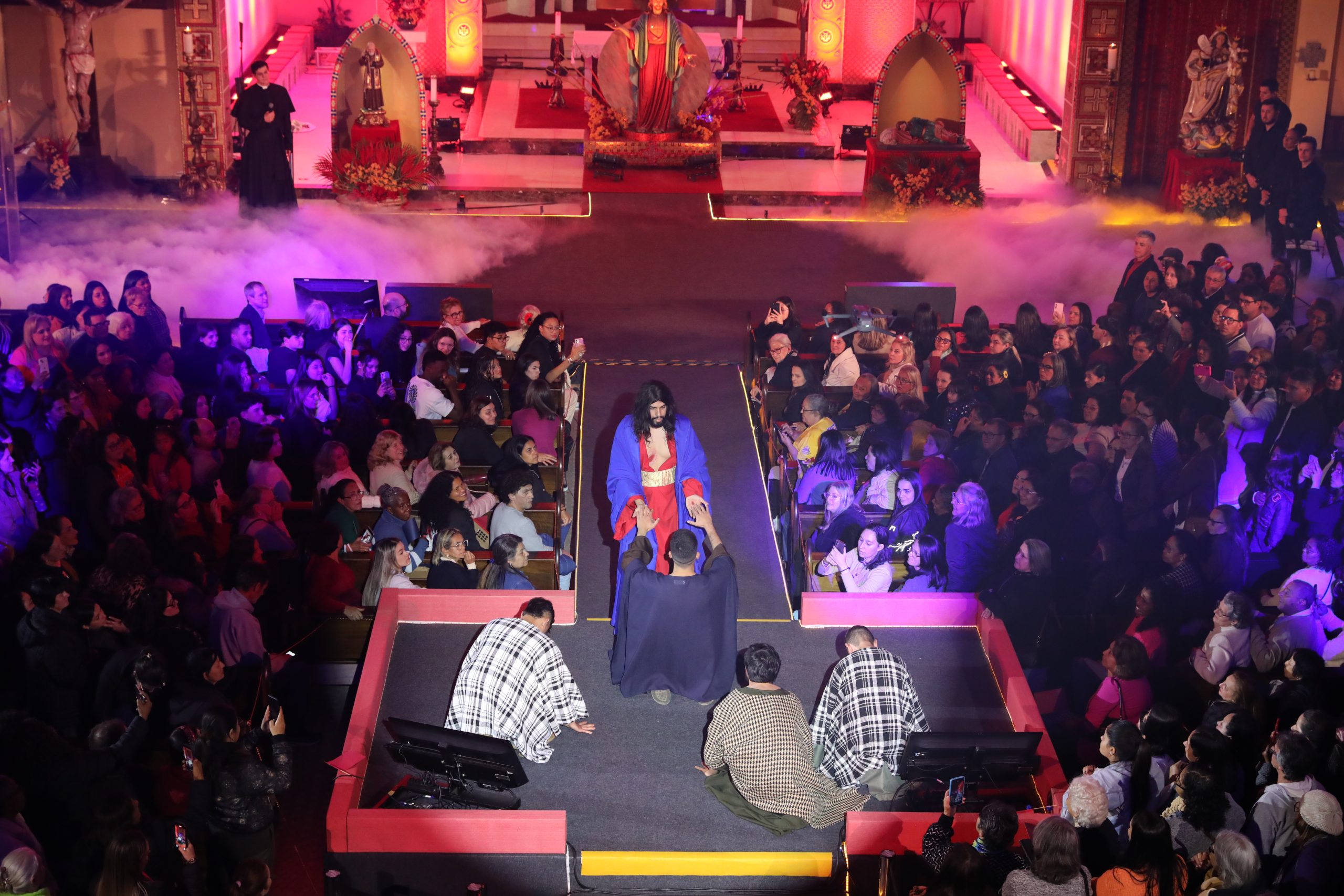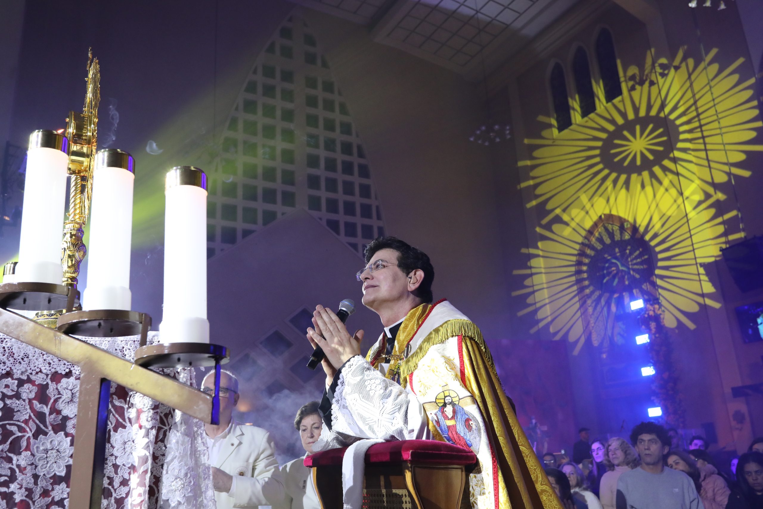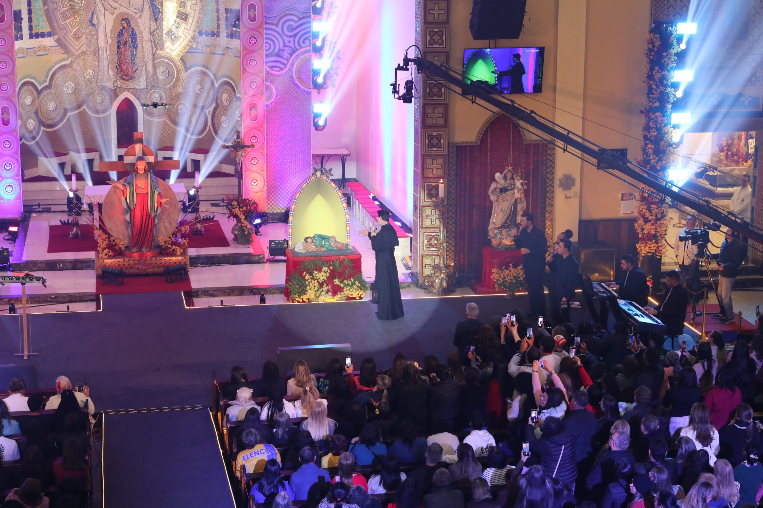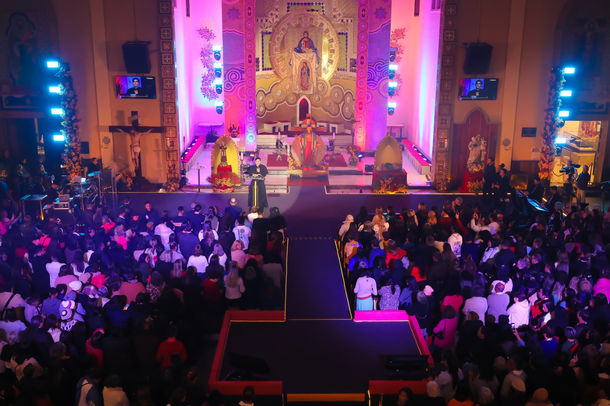Padre Reginaldo Manzotti recebeu Frei Renan, Padre Ezequiel Dal Pozzo e Joelma Datovo no seu show desta sexta-feira na X Festa das Santas Chagas. O show marcou o início do Jubileu de 20 anos da Associação Evangelizar É Preciso.