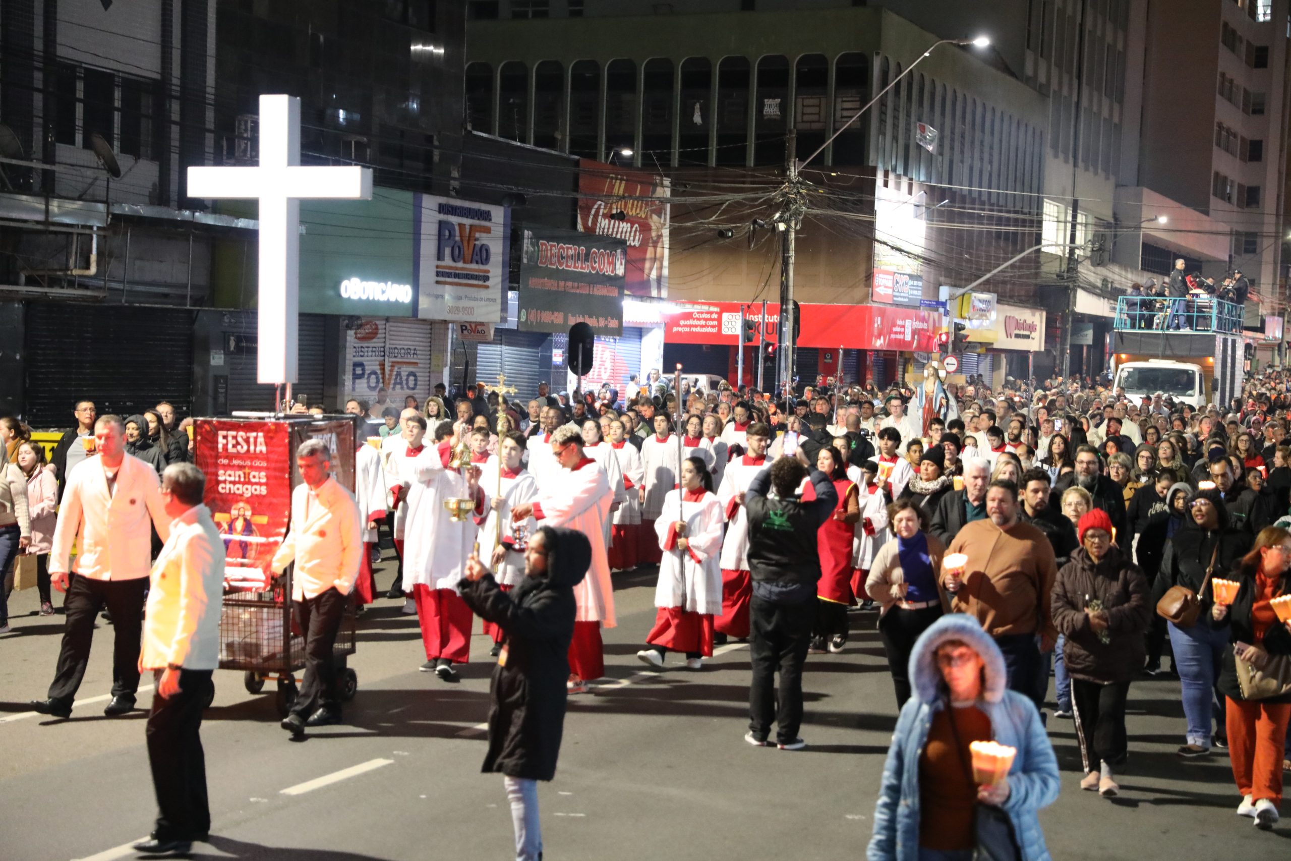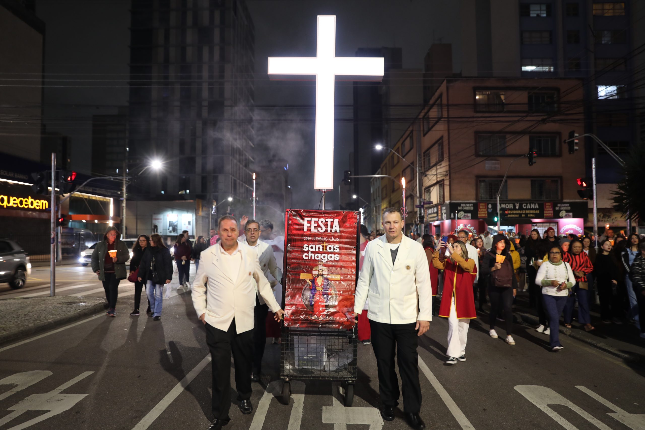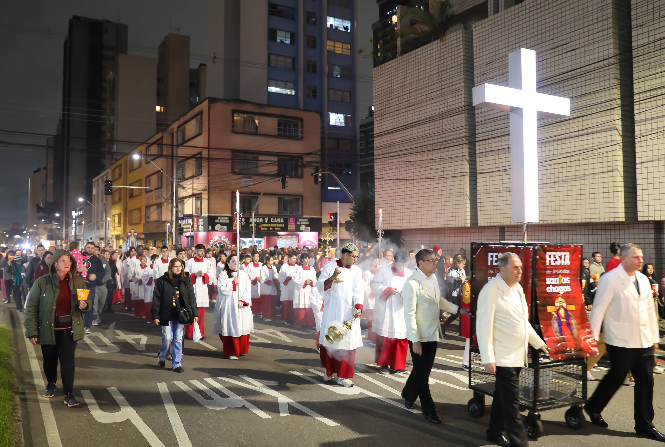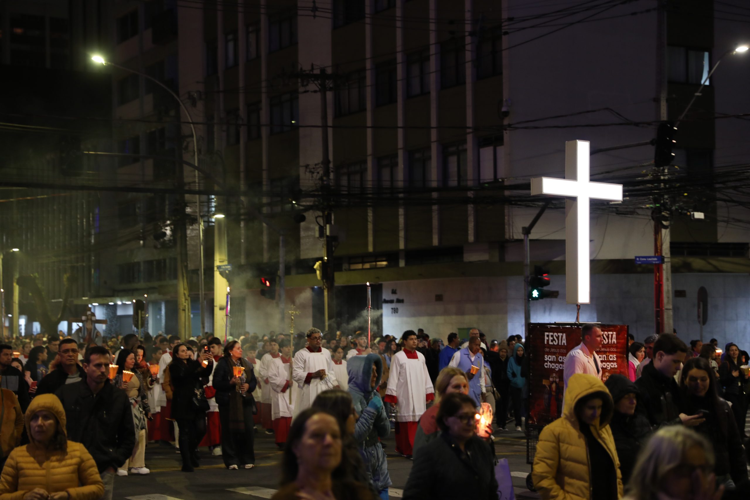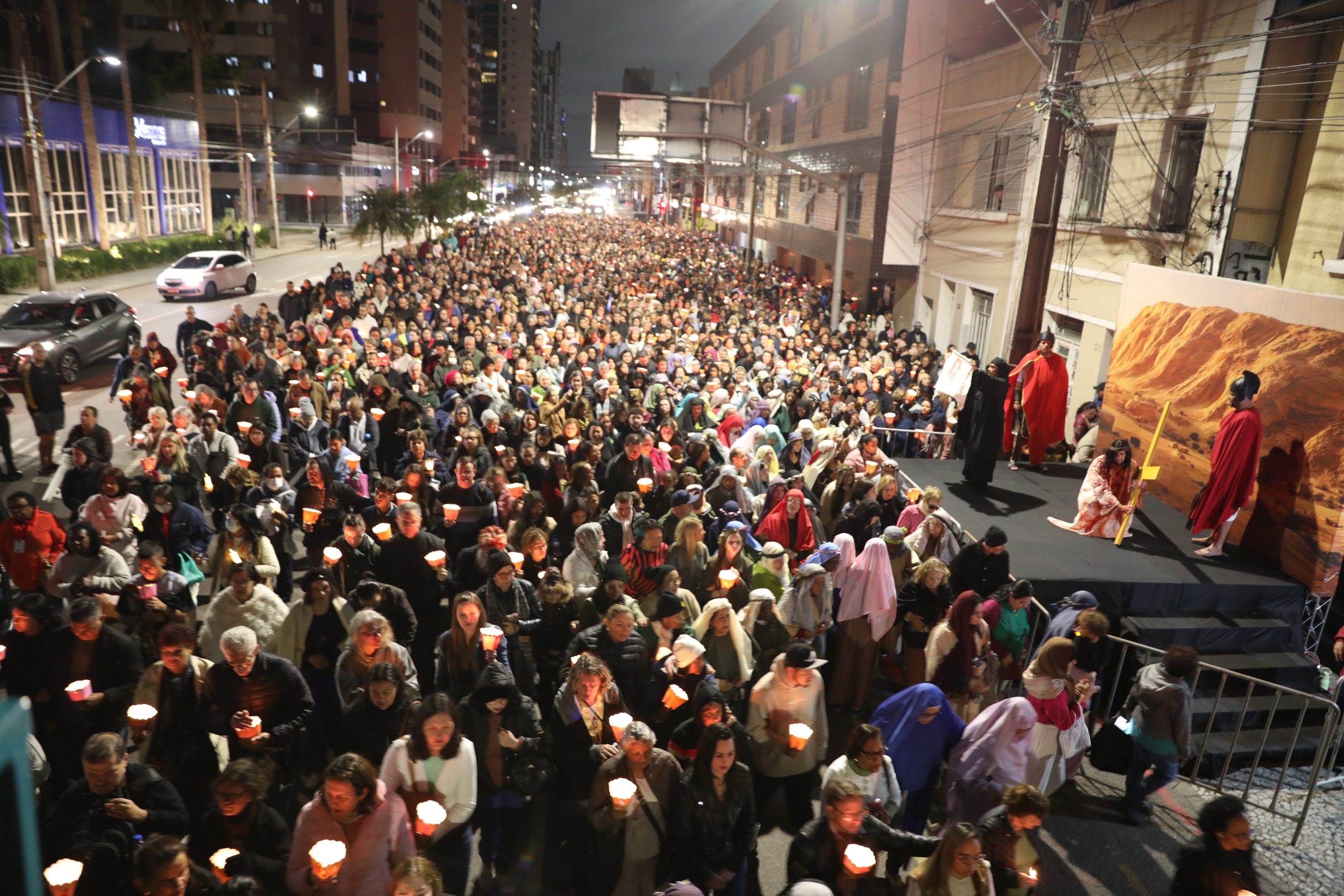 Na noite deste sábado, 27 de setembro, o centro de Curitiba foi palco de um dos momentos mais marcantes da décima edição da Festa de Jesus das Santas Chagas 2025: a tradicional procissão com encenação da Via Sacra, conduzida pelo Padre Reginaldo Manzotti. O evento reuniu milhares de fiéis em oração e reflexão sobre a Paixão, Morte e Ressurreição de Cristo.