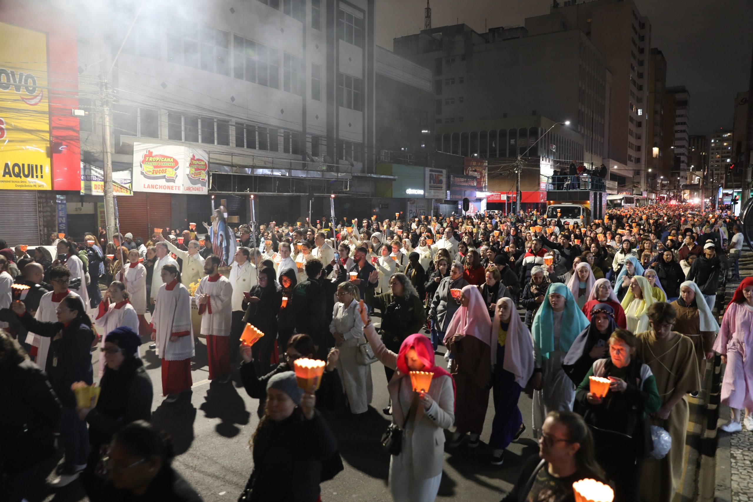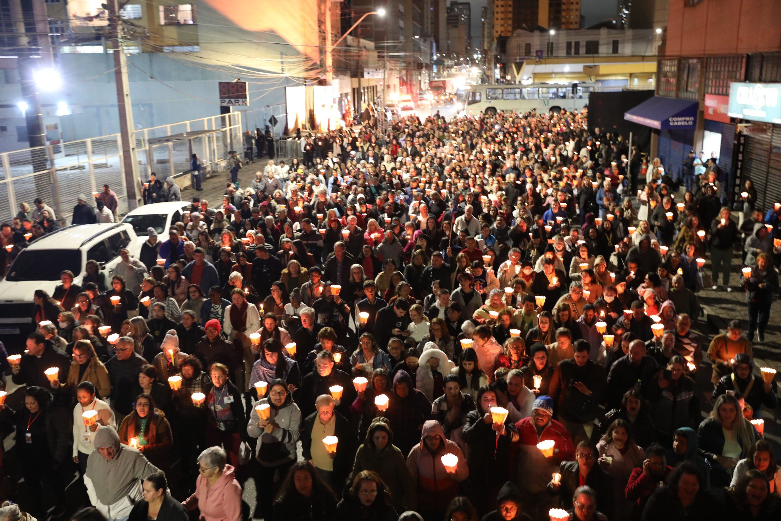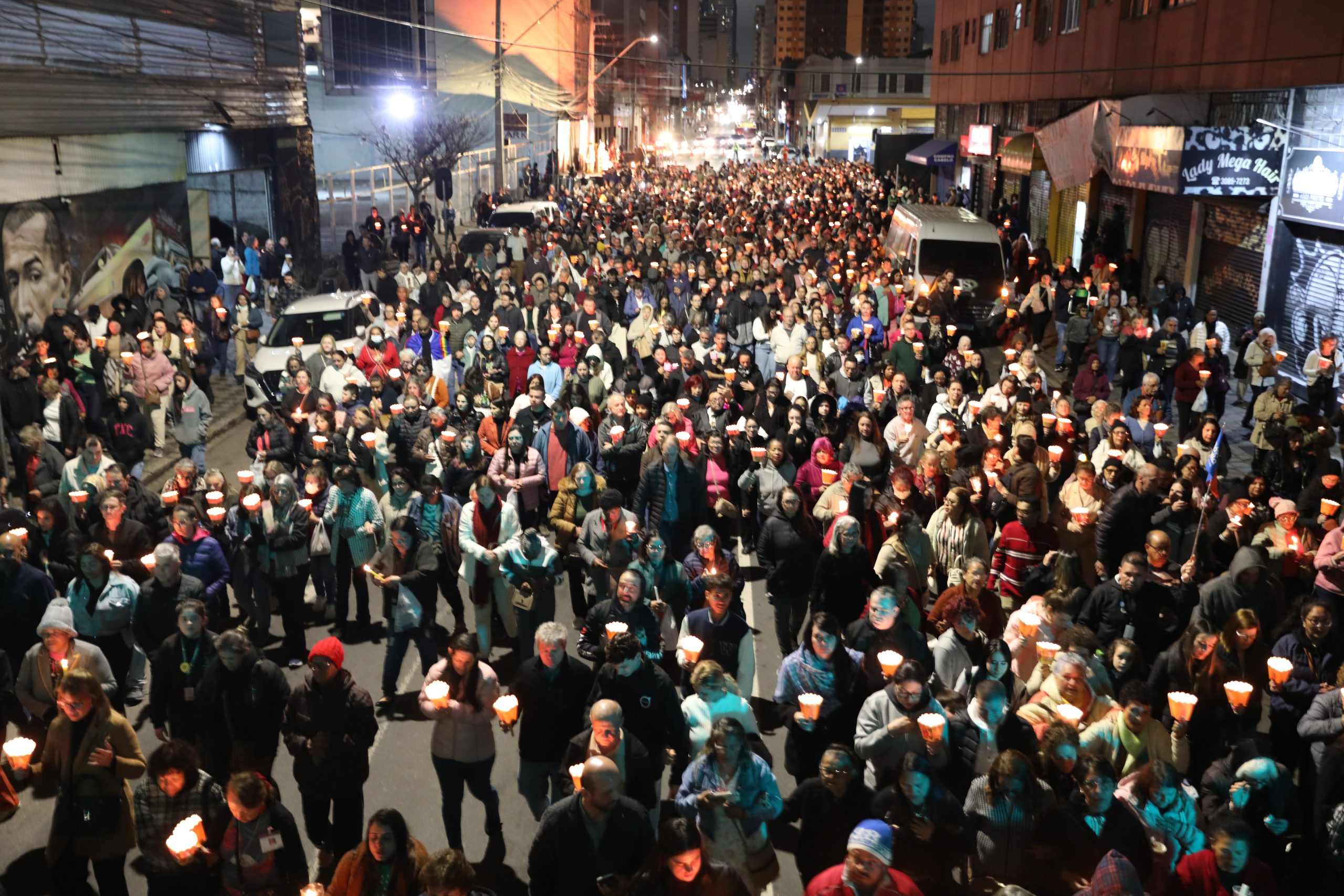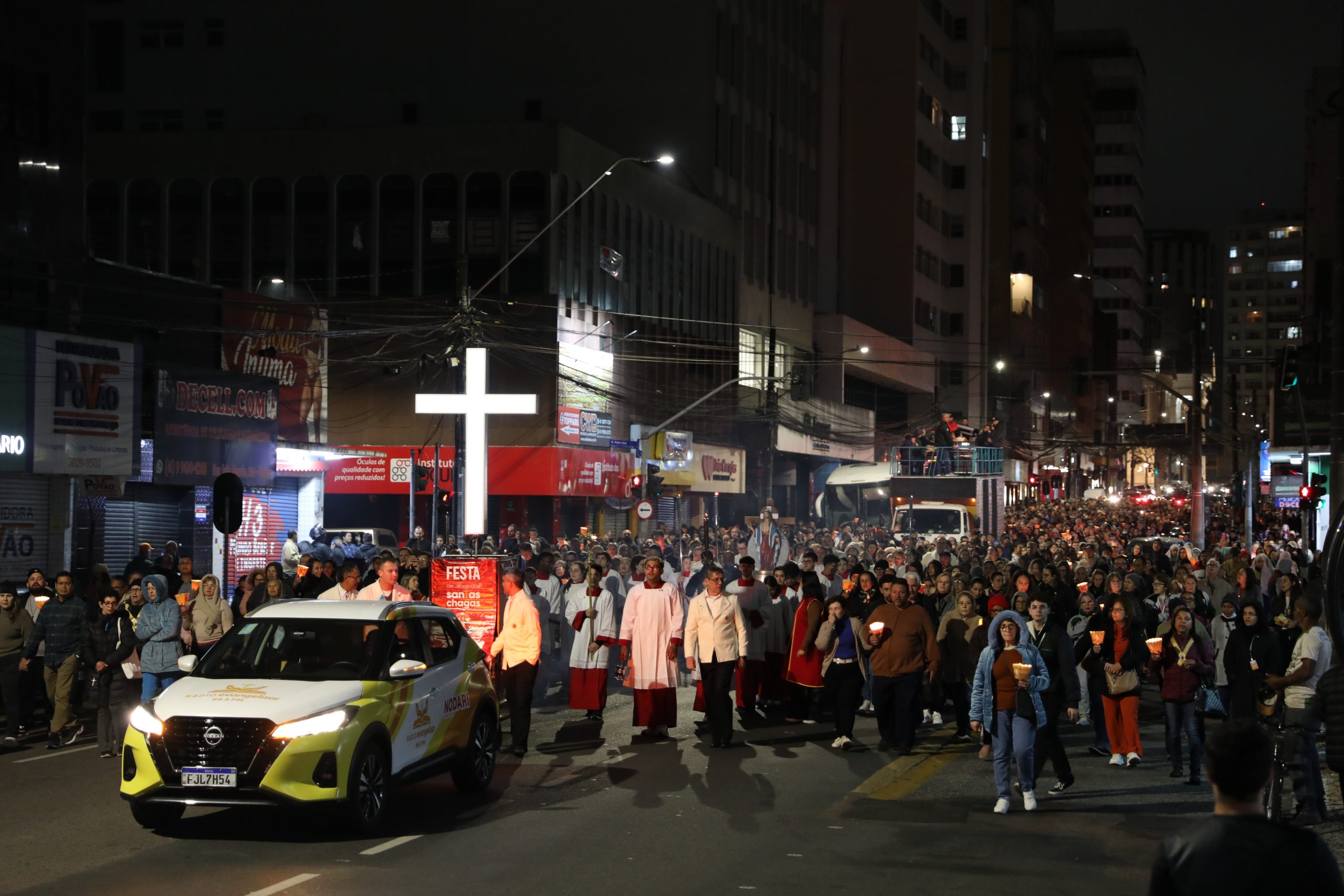 Na noite deste sábado, 27 de setembro, o centro de Curitiba foi palco de um dos momentos mais marcantes da décima edição da Festa de Jesus das Santas Chagas 2025: a tradicional procissão com encenação da Via Sacra, conduzida pelo Padre Reginaldo Manzotti. O evento reuniu milhares de fiéis em oração e reflexão sobre a Paixão, Morte e Ressurreição de Cristo.